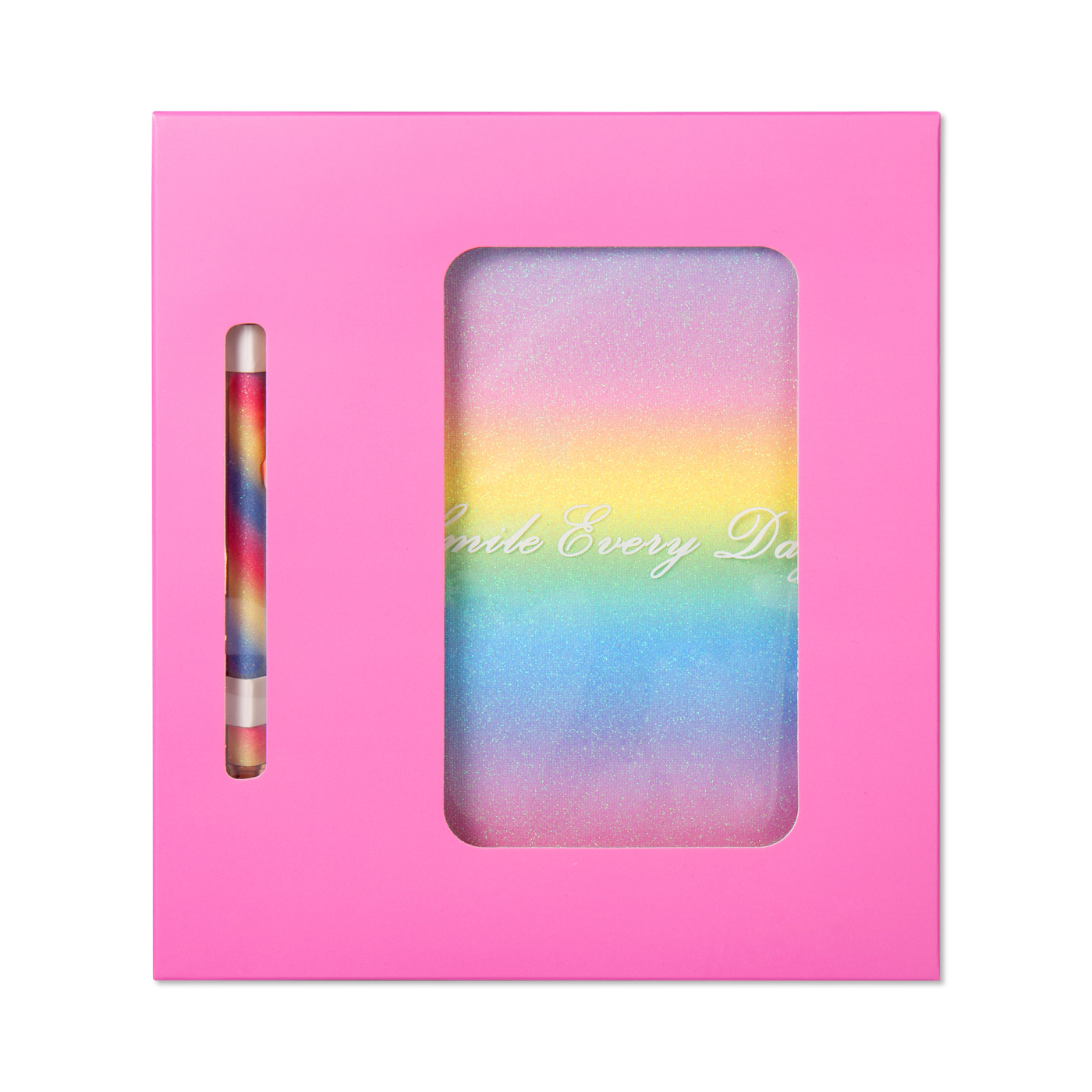 Duhový a třpytivý set bloku a propisky vykouzlí úsměv na tváři. Set je v dárkovém balení, blok je linkovaný a propiska má modrý inkoust. Rozměry balení: 19 cm × 22 cm Rozměry bloku: A5