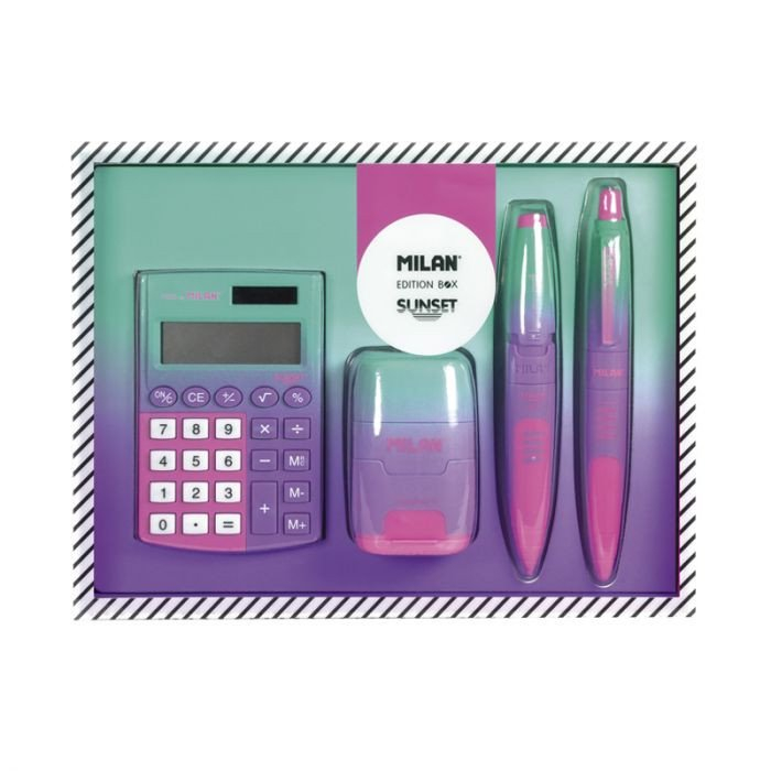 Dárkový set edice MILAN Sunset. • kalkulačka se základními funkcemi • pryž se ořezávátkem Capsule • kuličkové pero • mikrotužka