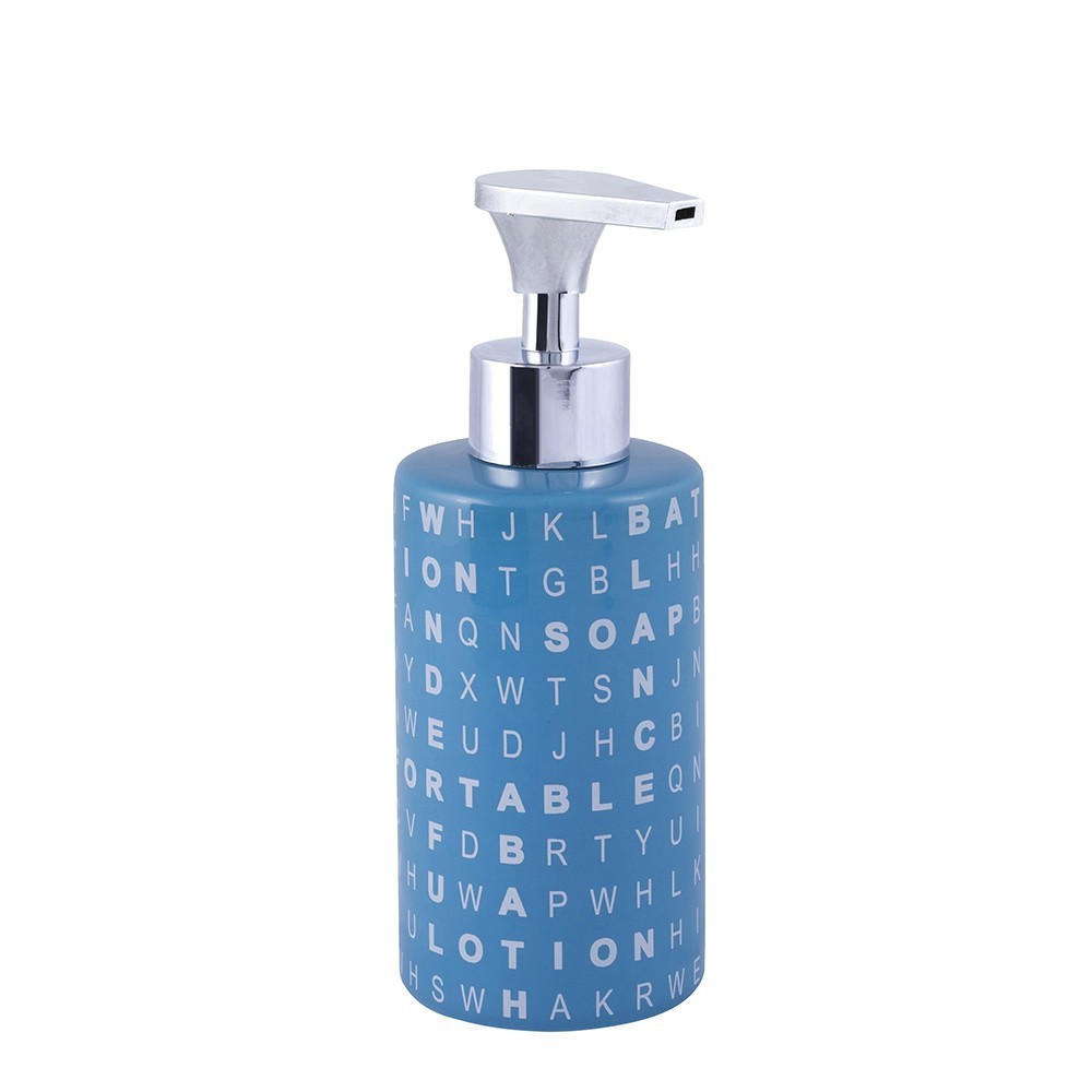 Moderní dávkovač tekutého mýdla ze série ENZO. Jeho modré pouzdro má bílé písmo. Kapacita dávkovače je 270 mililitrů.