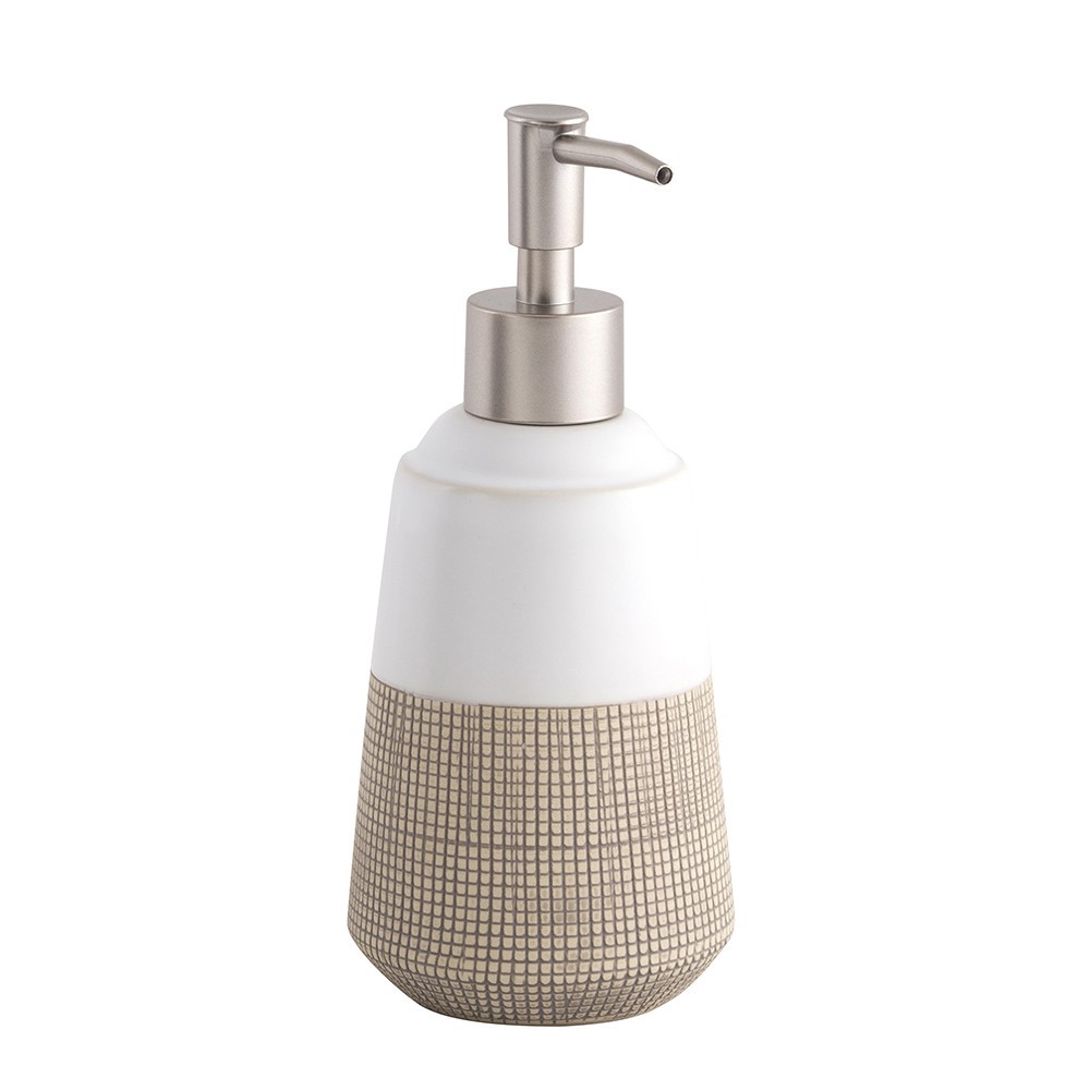 Dávkovač mýdla ze série ISANA. Jeho pouzdro je vyrobeno z kameniny. Spodní hnědá část má drážky, které usnadňují držení, horní část má hladký povrch a je bílá. Kapacita dávkovače mýdla je 465 ml.