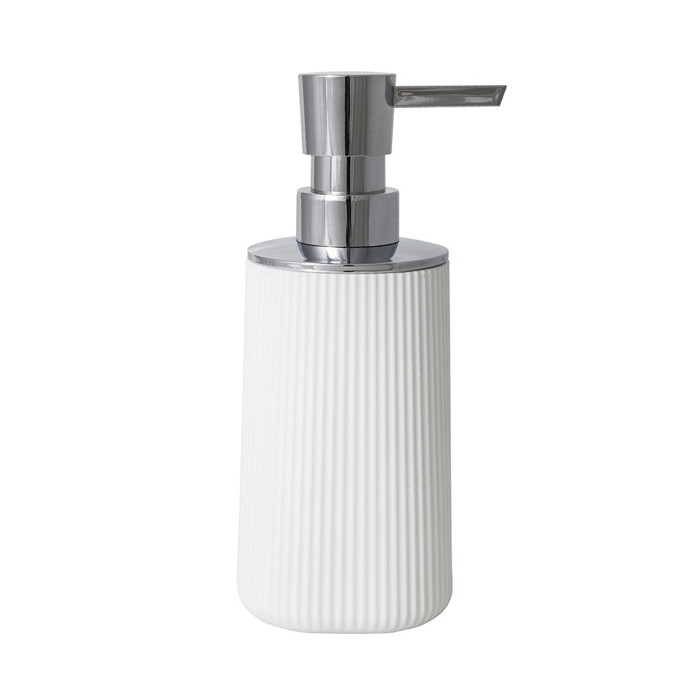 Dávkovač mýdla ze série Zen v bílé barvě. To je kvintesence čisté formy a minimalismu. Textura produktu je velmi praktická při použití a zabraňuje vyklouznutí z rukou. Kapacita dávkovače je 250 ml.