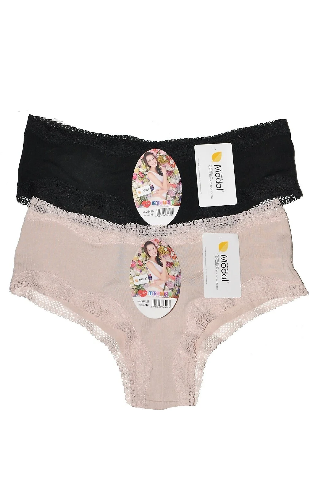 Dámské kalhotky z modalu příjemného na tělo - klasický střih - pas a nohavice zdobené krajkou - svislý šev na přední a zadní straně - baleno v polyetylenovém sáčku po 12 kusech - náhodně vybrané barvy: ecru, béžová, písková, černá Složení: 94 % modal, 6 % elastan