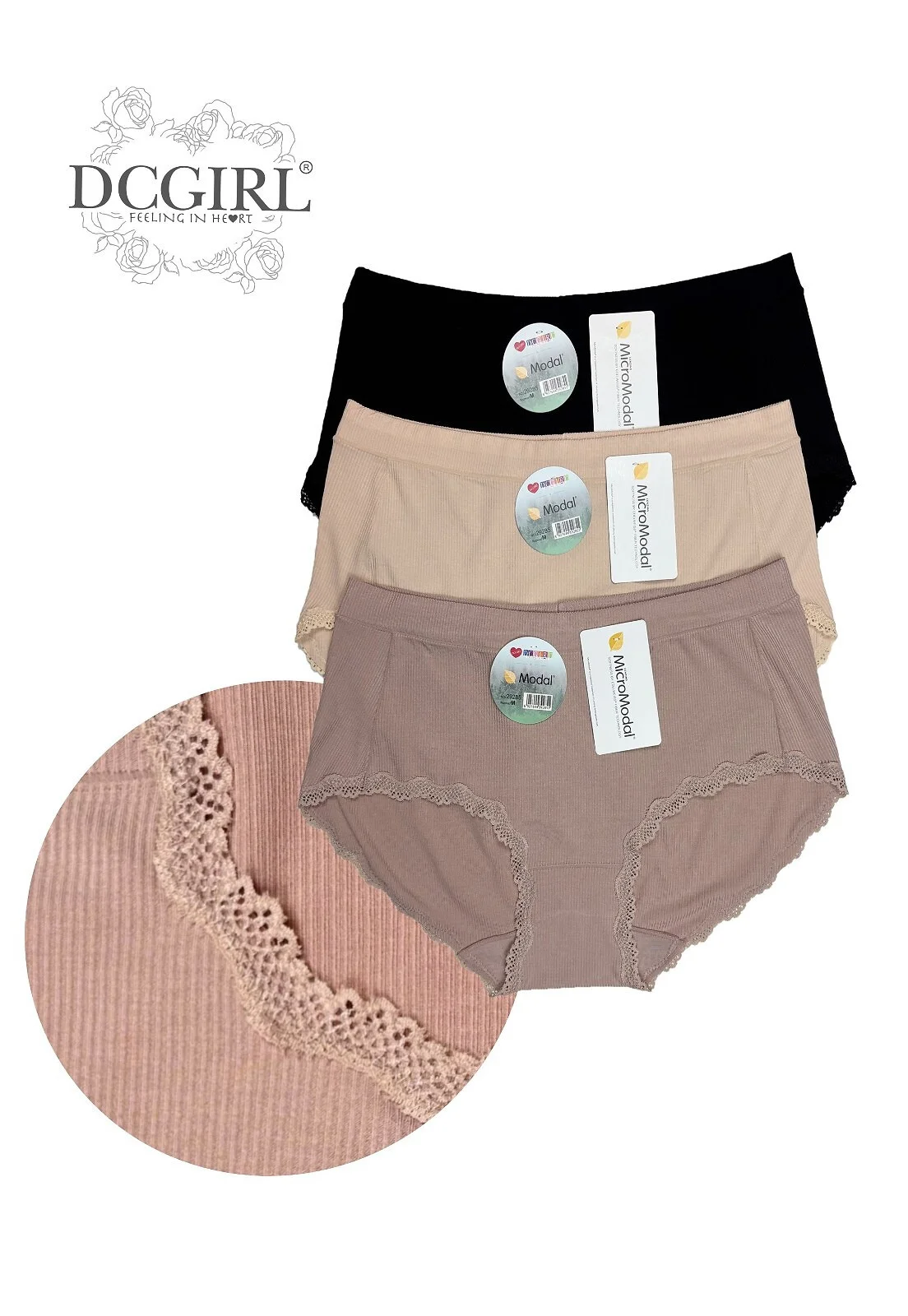 Dámské kalhotky z modalu příjemného na tělo - jemná žebrovaná struktura tkaniny - dvojitý pas - nohavice zdobené krajkou - zesílené boky - baleno v polyetylenovém sáčku po 12 kusech - náhodně vybrané barvy: béžová, černá, moka - dostupné velikosti v balení: M, L, XL Složení: 89,5 % mikromodal, 10,5 % elastan