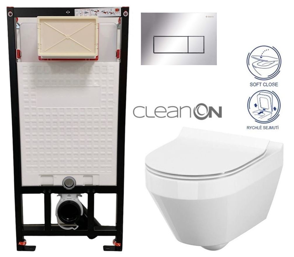 Deante podomítkový rám pro závěsné WC mísy (CST_WC01) Podomítkový rám je určen k zavěšení WC mís. Je vybaven systémem dvojitého splachování a dodatečným zvukotěsným těsněním. Celek je stabilizován odolným ocelovým rámem. Rám je určený pro sádrokartonovou montáž nebo před nosnou stěnu. výška [mm]: 1176 šířka [mm]: 510 hloubka [mm]: 160 nastavení výšky stojanu [mm]: 200 výchozí nastavení pro nízké splachování (l): 3 výchozí nastavení vysokého splachování (l): 6 kapacita nádrže [l] : 9 připojovací ventil: G1/2 " dvojité splachování [I]: 3/ 6 tiché splachování a plnění: ano ano rychlá a snadná montáž nastavení objemu splachování 180 mm a 230 mm rozteč montážních šroubů Splachovací tlačítko, pro podomítkové systémy - lesklý chrom (CST_051P) Splachovací dovoučinné tlačítko Deante je velmi decentní a zároveň dekorativní. Díky moderní lesklé povrchové úpravě se hodí do interiérů zařízených v moderním, skandinávském nebo minimalistickém stylu. Tlačítko je velmi tenké, díky čemuž téměř splyne s povrchem stěny. rozměr: 247 x 165 x 5,5 mm Závěsná mísa CREA, CLEAN ON (K114-015) Výška: 38 cmŠířka: 35,5 cmHloubka: 52 cmHmotnost: 23,9 kg Závěsná mísa CREA, CLEAN ON /bez oplachového kruhu/ se zadním odtokem, funkce splachování 3,5l. WC sedátko CREA, ovál (K98-0177) WC sedátko vyrobeno z odolného duroplasotu, s antibakteriální složkou. SOFT CLOSE /volně padající/, s jednoduchým sejmutím a upevněním sedátka pomocí jednoho tlačítka.