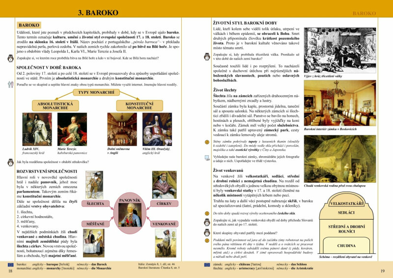 <p>Učebnice zahrnuje období od skončení třicetileté války do roku 1918. Žáci se dozvědí o změnách ve způsobech výroby, dopravy i složení společnosti, vzdělávání a umění. Součástí jsou přehledně zpracovaná schémata vynálezů. Stejně jako v předchozích dvou učebnicích je přiblížen běžný život lidí. Všechny neznámé pojmy jsou vysvětleny přímo na stránce a klíčové pojmy jsou uvedeny v angličtině a němčině. Zařazeny jsou tipy, jak si žáci mohou prohlubovat své vědomosti, mezipředmětové vztahy a průřezová témata. Časová přímka a mapy Evropy v různých obdobích jsou přiloženy.</p>