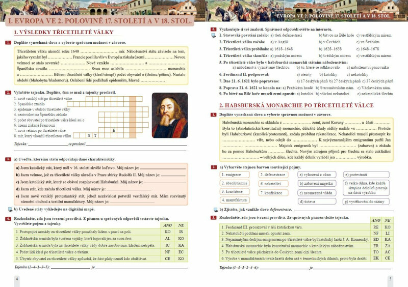 Předkládáme vám pracovní sešit pro výuku dějepisu v 8. ročníku základní školy a v odpovídajících ročnících víceletých gymnázií, který je vytvořen v souladu se zásadami RVP ZV. Naším cílem bylo vytvořit učební materiál, který by v sobě spojoval klasický sešit se zápisem a úkoly k procvičení probraného učiva (např. křížovky, přiřazovací cvičení, skrývačky, přesmyčky, čtyřsměrky). Snažíme se u žáků rozvíjet čtenářskou gramotnost a práci s mapou. Mapy můžete používat při probírání dané kapitoly, můžete se k nim i vracet. Při práci s pracovním sešitem doporučujeme nejprve probrat novou látku a pak vyplnit úvodní cvičení (obdoba zápisu v běžném sešitě) s použitím učebnice. V následující hodině navrhujeme zopakovat a procvičit učivo z předchozí hodiny formou hravých úkolů a následně se věnovat nové kapitole. Věříme, že čas, který získáte tím, že žáci nebudou opisovat zápis z tabule, využijete k oživení učiva, například videem. U úkolů, při nichž žáci rozhodují, zda jsou tvrzení pravdivá, doporučujeme chybná tvrzení ústně opravit. Při práci s žáky se speciálními vzdělávacími potřebami doporučujeme v úvodním cvičení, které nahrazuje zápis, zvýraznit klíčová slova a pojmy. Na konci pracovního sešitu se nachází závěrečný test se souhrnným opakováním.