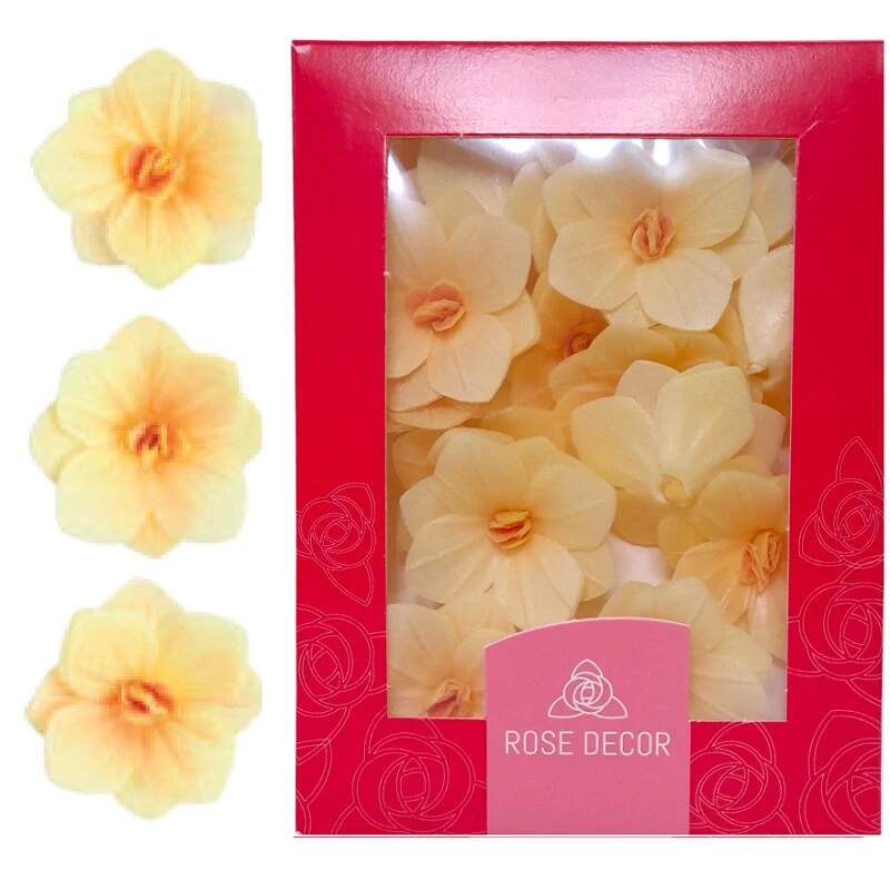 Balení obsahuje 18 ks. Velikost květiny je cca 38 mm. Tzv. jedlý papír. Vhodná na zdobení dortů, rolád, dezertů apod. Složení: škrob, koncentrát šafránu, koncentrát světlice barvířské, barvivo E172, E129, E102, koncentrát jablečno-ředkvovo-rybízový, aroma. Barviva E129, E102 mohou mít negativní vliv na činnost a pozornost dětí. Výživové hodnoty (ve 100g výrobku): Energetická hodnota: 1560 kJ/ 367 kcal; tuky 1 g (z toho nasycené mastné kyseliny 0,1 g); sacharidy 89,04 g (z toho cukry 0,5 g); bílkoviny 0,56 g; sůl 0,07 g.