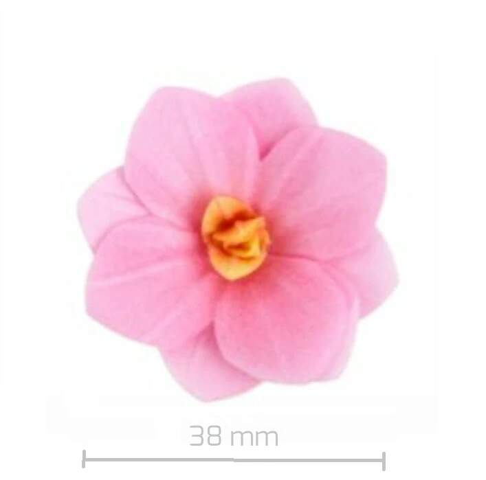 Balení obsahuje 3 ks. Velikost květiny je cca 38 mm. Tzv. jedlý papír. Vhodná na zdobení dortů, rolád, dezertů apod. Složení: škrob, jablečno-ředkvičkovo-rybízový koncentrát, zahušťovadlo: E466, světlicový koncentrát, aroma, barvivo: E172 Výživové hodnoty (ve 100g výrobku): Energetická hodnota 1439 kJ/ 341 kcal; tuky 0,5 g ( z toho nasycené mastné kyseliny 0 g); sacharidy 84,5 g (z toho cukry 0,3 g); bílkoviny 0,15 g; sůl 0,06 g.