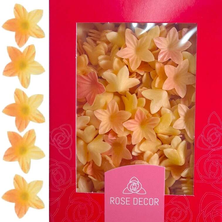Dekorace oplatková - Květ mini žlutý, 400 ks Tzv. jedlý papír. Rozměr květu je 2 cm. Vhodná na zdobení dortů, rolád, dezertů, cupcakes apod. Složení: škrob, koncentrát Carhtamusa, barvivo E172 (žlutá), koncentrát jablečno-ředkvičko-rybízový Výživové hodnoty na 100g výrobku: energie 1504 kJ/ 354 kcal; tuky 0 g ( z toho nasycené mastné kyseliny 0 g); sacharidy 87,2 g (z toho cukry 0,6 g); bílkoviny 0 g; sůl 0,03 g