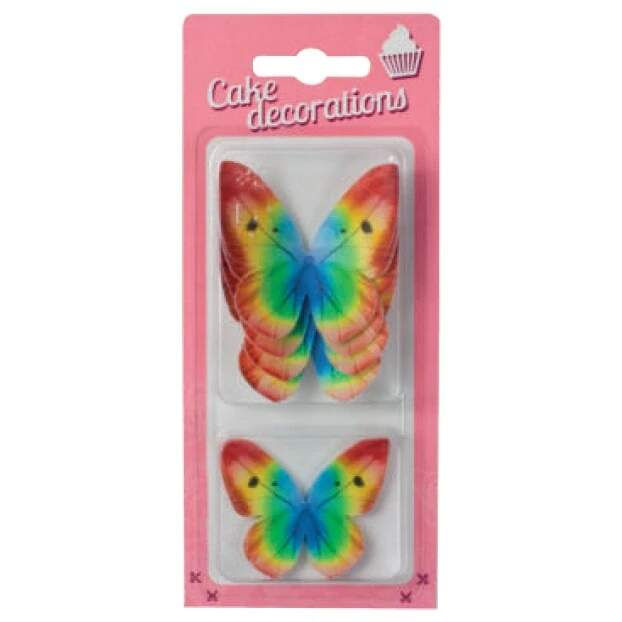 Balení obsahuje 8 ks (4 velký + 4 malý motýlek). Velikost motýlků: 5 cm / 4 cm. Tzv. jedlý papír. Vhodné na zdobení narozeninových, slavnostních či svatebních dortů, dezertů a pod. Složení: bramborový škrob, zahušťovadlo E466, aroma, barvivo E172, E102. Barvivo E102 může mít negativní vliv na činnost a pozornost dětí. Výživové hodnoty (ve 100g výrobku): Energetická hodnota: 1560 kJ/ 367 kcal; tuky 1 g (z toho nasycené mastné kyseliny 0,1 g); sacharidy 89,04 g (z toho cukry 0,5 g); bílkoviny 0,56 g; sůl 0,07 g.