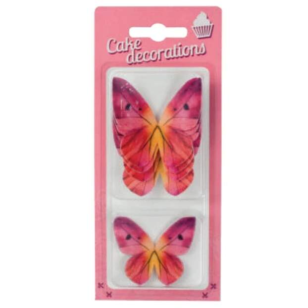 Balení obsahuje 8 ks (4 velký + 4 malý motýlek). Velikost motýlků: 5 cm / 4 cm. Tzv. jedlý papír. Vhodné na zdobení narozeninových, slavnostních či svatebních dortů, dezertů a pod. Složení:  bramborový škrob, zahušťovadlo E466, aroma, barvivo E172, E102.  Barvivo E102 může mít negativní vliv na činnost a pozornost dětí. Výživové hodnoty (ve 100g výrobku):  Energetická hodnota: 1560 kJ/ 367 kcal; tuky 1 g (z toho nasycené mastné kyseliny 0,1 g); sacharidy 89,04 g (z toho cukry 0,5 g); bílkoviny 0,56 g; sůl 0,07 g.