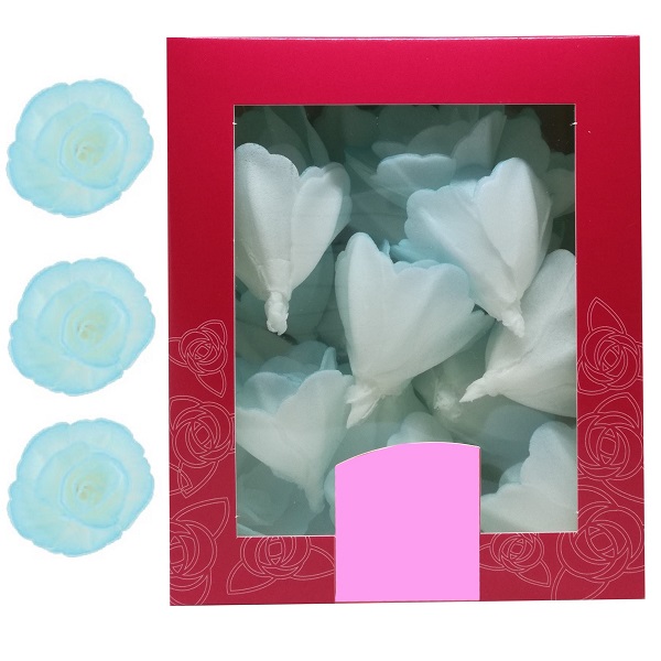 Dekorace oplatková - Růže malá 30 mm, sv. modrá balení obsahuje 35 ks Tzv. jedlý papír. Vhodná na zdobení dortů, rolád, dezertů apod. Složení: bramborový škrob, aroma, zahušťovací látka E466, barvivo: E133. Výživové hodnoty na 100g výrobku: energie 1439 kJ/ 341 kcal; tuky 0,5g ( z toho nasycené mastné kyseliny 0 g); sacharidy 84,5 g (z toho cukry 0,3 g); bílkoviny 0,15 g; sůl 0,06 g.