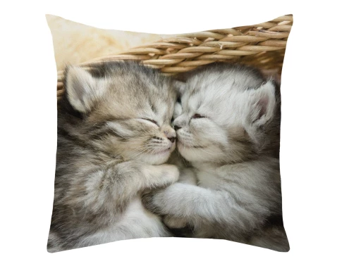 Dekorační polštář 25x25 cm s obrázkem spících koťat v košíku přinese do interiéru pohodu a radost pro milovníky koček.