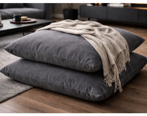 Set obsahuje 2 velké pohodlné polštáře v šedé barvě, které se skvěle hodí jako stylový doplněk i praktický pomocník pro komfortní sezení.