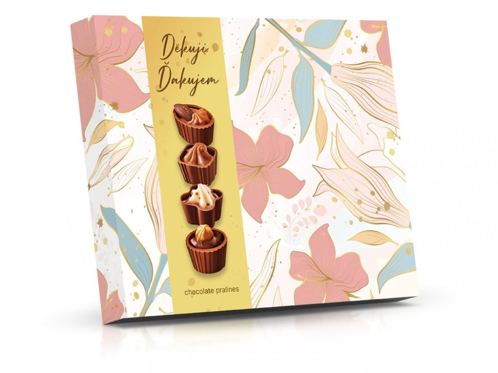 Lahodné plněné čokoládové pohárky z hořké a mléčné čokolády. Lahodné čokoládové pohárky s lískooříškovým, mandlovým a mléčným krémem. Složení: Hořká čokoláda (cukr, kakaová hmota, kakaové máslo, sušená syrovátka (z mléka), emulgátor: sójový lecitin, aroma vanilin). Náplň (60%): rostlinný tuk (palmový olej), cukr, pražené mandle (5%), sušené odstředěné mléko, sušená syrovátka (z mléka), pražené lískové ořechy (4%), kakaový prášek, kakaová hmota, laktóza (z mléka), sušené mléko, karamelové křupinky (cukr, sójové boby, nehydrogenovaný palmový olej, glukózový sirup, barvivo: karamel E150a, přírodní aroma "karamelové máslo"), práškový jogurt, jahodové lupínky, emulgátor (sójový lecitin), příchuť vanilin, regulátor kyselosti (kyselina mléčná). Informace pro alergiky: Může obsahovat stopy arašídů a lepku. Skladujte na suchém místě, chraňte před teplem.