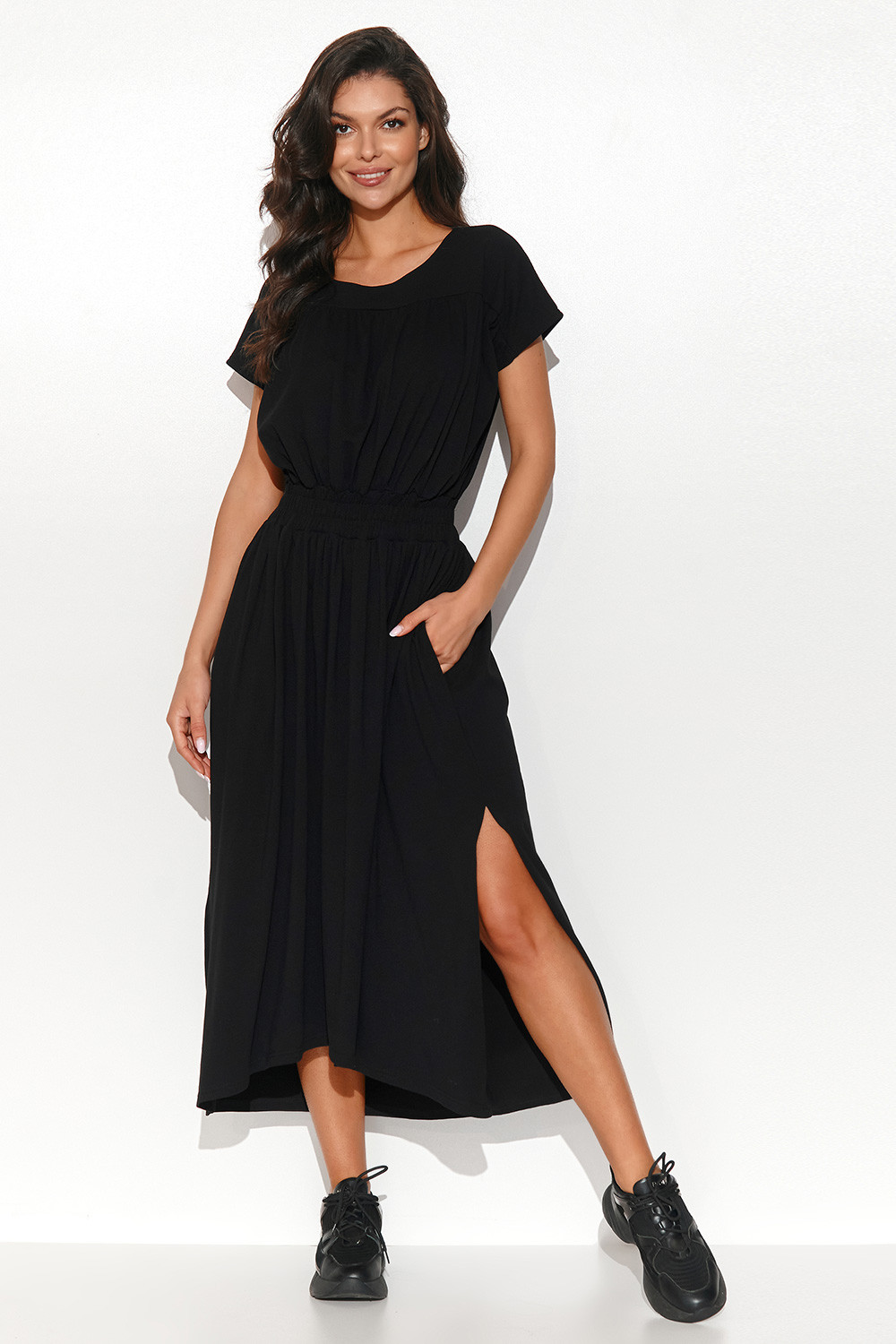 Dlouhé asymetrické šaty ušité z úpletové teplákoviny. Mají kulatý výstřih a v pase jsou opatřeny stahovací gumou. Zadní část šatů je o něco delší než přední, díky čemuž ležérní kreace vypadá na siluetě zajímavě. Téměř po celé délce mají šaty jemné řasení. Na bocích jsou postranní nakládané kapsy. Kulatý výstřih ponechává prostor pro krásný řetízek. Krátké rukávy naopak maskují ramínka spodního prádla. Oblečte si je k oblíbeným botám nebo sandálům a užijte si ležérní, ale elegantní vzhled. Bavlna 95 % Elastan 5 % Velikost DélkaObvod beder Obvod prsou Obvod v pase 36/38122 cm128 cm92 cm64-88 cm40/42136 cm136 cm100 cm68-96 cm