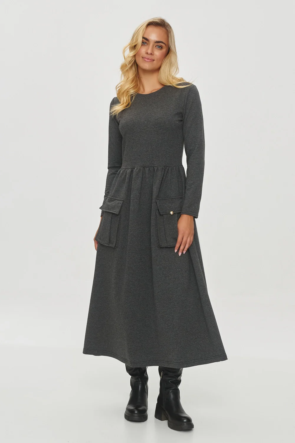 Rozšířené šaty jsou skvělou volbou pro lidi, kteří si cení spojení stylu a funkčnosti. Model má klasický, ženský střih s midi délkou a rozšířeným dnem. Vyrobeno z měkkého, pohodlného materiálu, který se skvěle hodí pro každodenní použití. Šaty mají dlouhé rukávy, co je činí ideální pro chladnější dny. Výstřih v pasu dává efekt jemného mačkání, které zdůrazňuje siluetu a dodává šatům šarm. Charakteristickým prvkem jsou velké, nasazené kapsy vpředu, navíc zdobené elegantním pozlaceným detailom, který nejen přidává styl, ale také plní praktickou funkci. Tento model kombinuje pohodlí a módní design a je ideální volbou pro různé příležitosti. Bavlna 95 % Elastan 5 % Velikost DélkaObvod beder Obvod prsou Obvod v pase 36122 cm124 cm80 cm76 cm38126 cm128 cm84 cm80 cm40130 cm132 cm88 cm84 cm