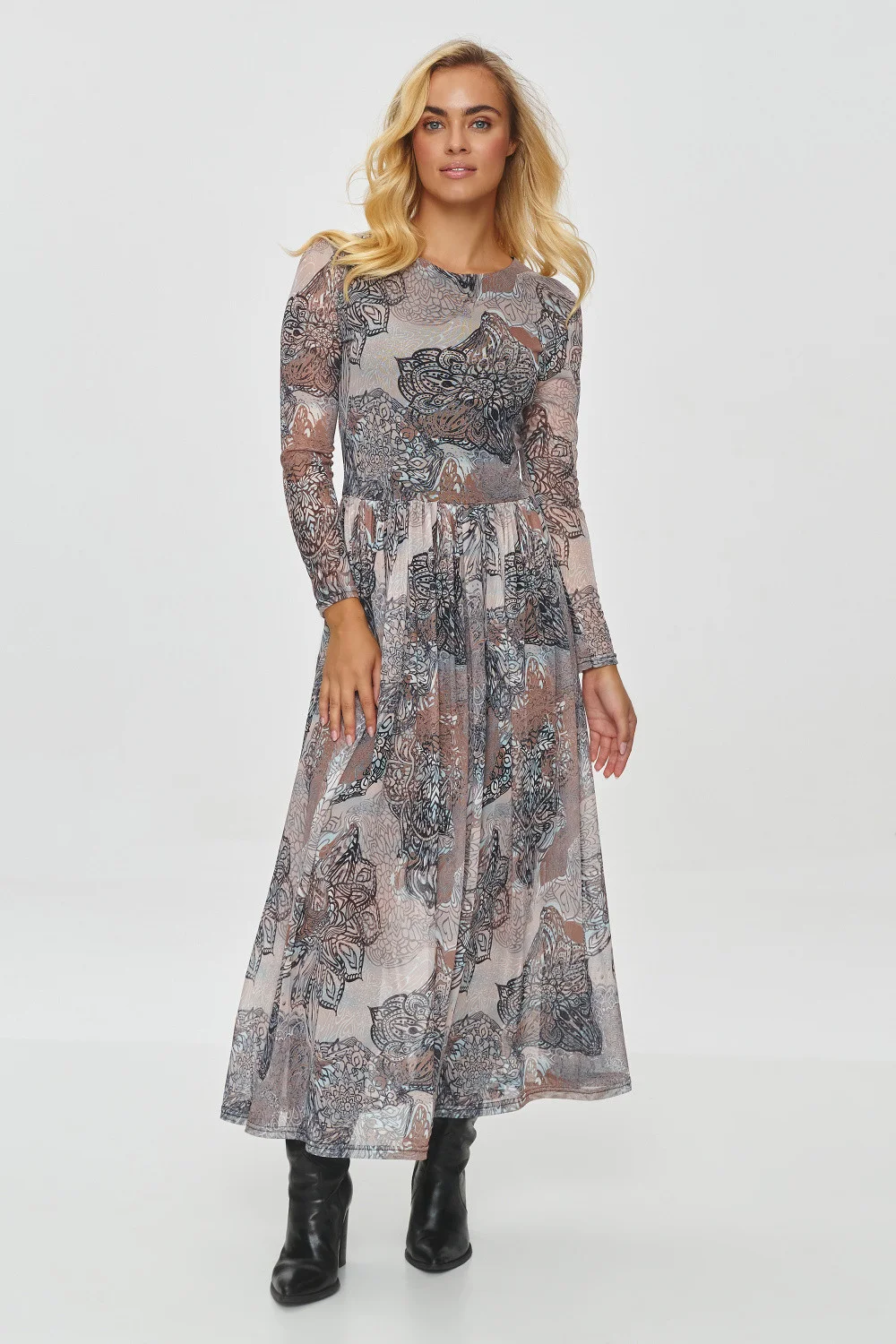 Dlouhé potiskové šaty vyrobené z lehkého, prosvětleného materiálu, který jim dodává elegantní a romantický vzhled. Vzor šatů je složitá směs rostlinných, zvířecích a abstraktních motivů v dominujících barvách černé, bílé, béžové, hnědé a odstínech oranžové. Vzor je složitý a zároveň originální, dodávající kreaci výrazný styl. Model má lehce přizpůsobený vrch, který zdůrazňuje pas, zatímco spodek je rozšířený, což mu dodává lehkosti a pohybu. Dokončení šatů je jemné a materiál je poloprůhledný, což zdůrazňuje jejich jemnost. Šaty mají viskózovou podšívkou, která diskretně zakrývá strategická místa a zajišťuje pohodlí při nošení. Spojení s těžkými kotníkovými botami vytváří kontrast s jemností šatů, dodávající celku trochu více neformální vzhled. Šaty jsou ideální na podzimní nebo zimní večery díky svým teplým barvám a dlouhým rukávům. Kreace je k dispozici v pěti variantách, lišících se barvou a vzorem. Polyester 100 % Velikost DélkaObvod beder Obvod prsou Obvod v pase 36126 cm84 cm72 cm68 cm38128 cm88 cm76 cm72 cm40130 cm92 cm80 cm76 cm42132 cm96 cm84 cm80 cm