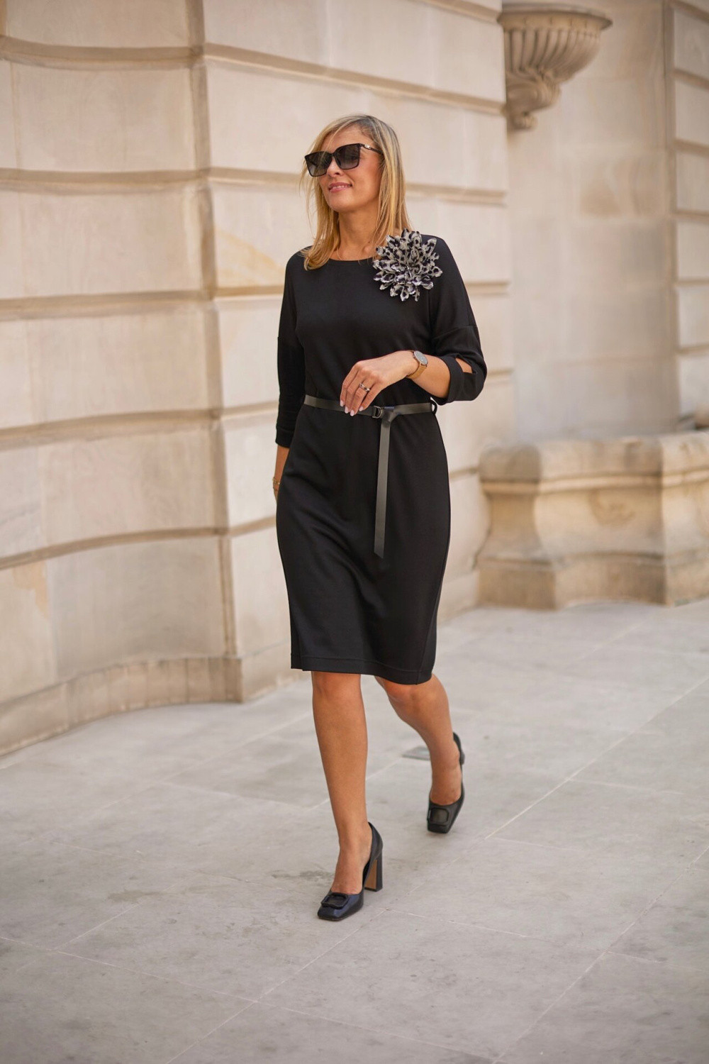 Velmi ženské a pohodlné šaty z žakárového úpletu s přídavkem elastanu. Navrženy v souladu se zásadami značky, tj. s ohledem na zralé ženy. Vrchní kimonový díl se spadajícími rukávy, pásek z ekokůže pro úpravu obvodu pasu, tlumené barvy a měkký a dobře ovladatelný úplet o hmotnosti cca 280 gm2. Díky tomu všemu jsou šaty ideální pro větší velikosti. Květina zobrazená na fotografiích je odnímatelná a je samozřejmě součástí šatů. Elastan 5 % Nylon 20 % Viskóza 75 % Velikost Obvod beder Obvod prsou Obvod v pase 3694-98 cm84-88 cm70-74 cm3898-102 cm88-92 cm74-78 cm40102-106 cm92-96 cm78-82 cm42106-110 cm96-100 cm82-86 cm44110-114 cm100-104 cm86-90 cm46114-118 cm104-108 cm90-94 cm