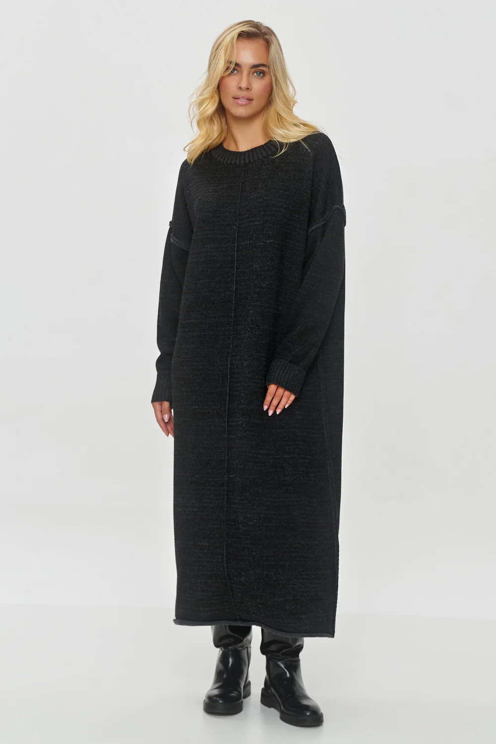Dámský dlouhý svetr volného střihu z látky s melanžovým vzorem. Svetr má oversized střih s dlouhými rukávy, což mu dodává na pohodlí a ležérním stylu, a snížená linie ramen dokonale zakrývá objemnější ramena. Je zakončen širokými žebrovanými manžetami, takže si můžete upravit délku rukávů a zároveň je ohrnout. Výstřih je zaoblený a zakončený žebrovaným lemem. Svetr sahá až ke kotníkům, čímž vytváří elegantní a originální vzhled, ideální pro chladnější dny. Na přední straně je viditelný svislý šev, který svetru dodává jemný detail a opticky prodlužuje siluetu. Je ideální volbou pro podzimní a zimní dny, dobře se kombinuje s vysokými botami. Svetr kombinuje pohodlí a styl, takže se hodí jak pro běžné, tak elegantnější příležitosti. Akryl 100 % Velikost DélkaObvod beder Obvod prsou Obvod v pase universal120 cm120 cm124 cm120 cm