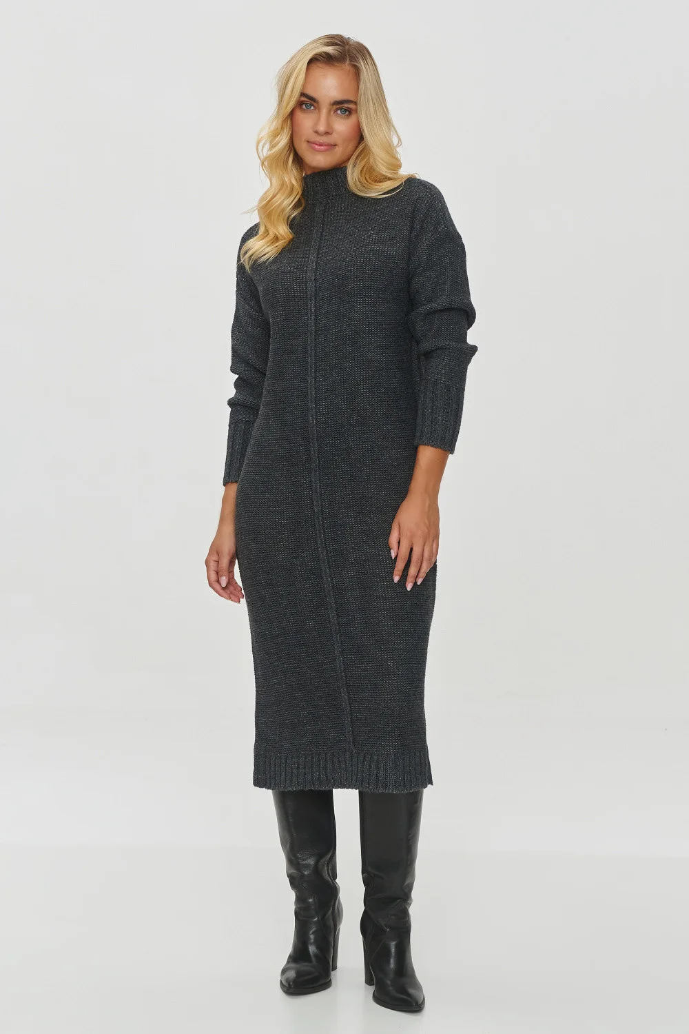 Tento dámský dlouhý svetr má jednoduchý, klasický střih, který sahá pod kolena, takže je ideální pro chladnější dny. Je vyroben ze silnější, tělové tkaniny s viditelnou strukturou úpletu. Vrchní část svetru má zaoblený výstřih a rukávy jsou dlouhé a zakončené širokým lemem, což dodává svetru větší eleganci a teplo. Vzor na svetru je minimalistický, bez dalších ozdob, s výjimkou jemné svislé linky procházející středem, která opticky prodlužuje siluetu. Tento svetr je ideální volbou pro zimní dny, neboť kombinuje pohodlí a styl. Lze jej nosit jak s vysokými botami, tak s ležérnější obuví, což z něj činí univerzální kousek šatníku. Akryl 85 % Polyamid 15 % Velikost DélkaObvod beder Obvod prsou Obvod v pase universal106 cm96 cm100 cm96 cm