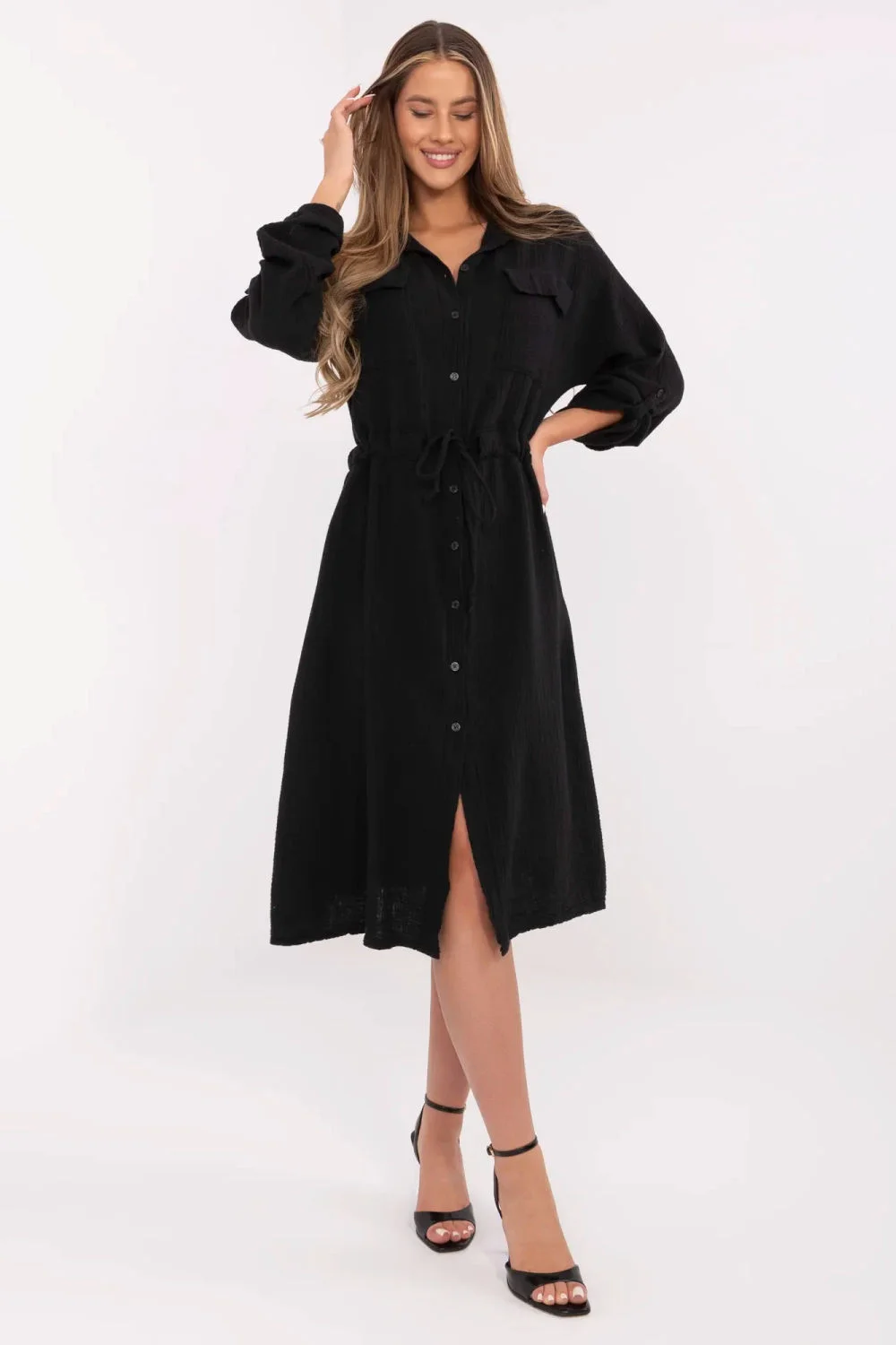 Elegantní letní šaty ve stylu košile, vyrobené z prodyšné přírodní bavlny. Hladká tkanina a klasická délka midi dělají z tohoto modelu skvělou volbu pro každodenní stylizace. Mají dlouhý rukáv s možností přehnutí, praktický límec a zapínání na knoflíky po celé délce. Šněrování v pase jemně zdůrazňuje pas, a kapsy s patkami na hrudi přidávají funkčnost a charakter. Ideální na procházky, do práce nebo na setkání s přáteli, univerzální a vždy stylové. Bavlna 100 % Velikost DélkaObvod beder Obvod prsou Obvod v pase universal121 cm112 cm120 cm82 cm