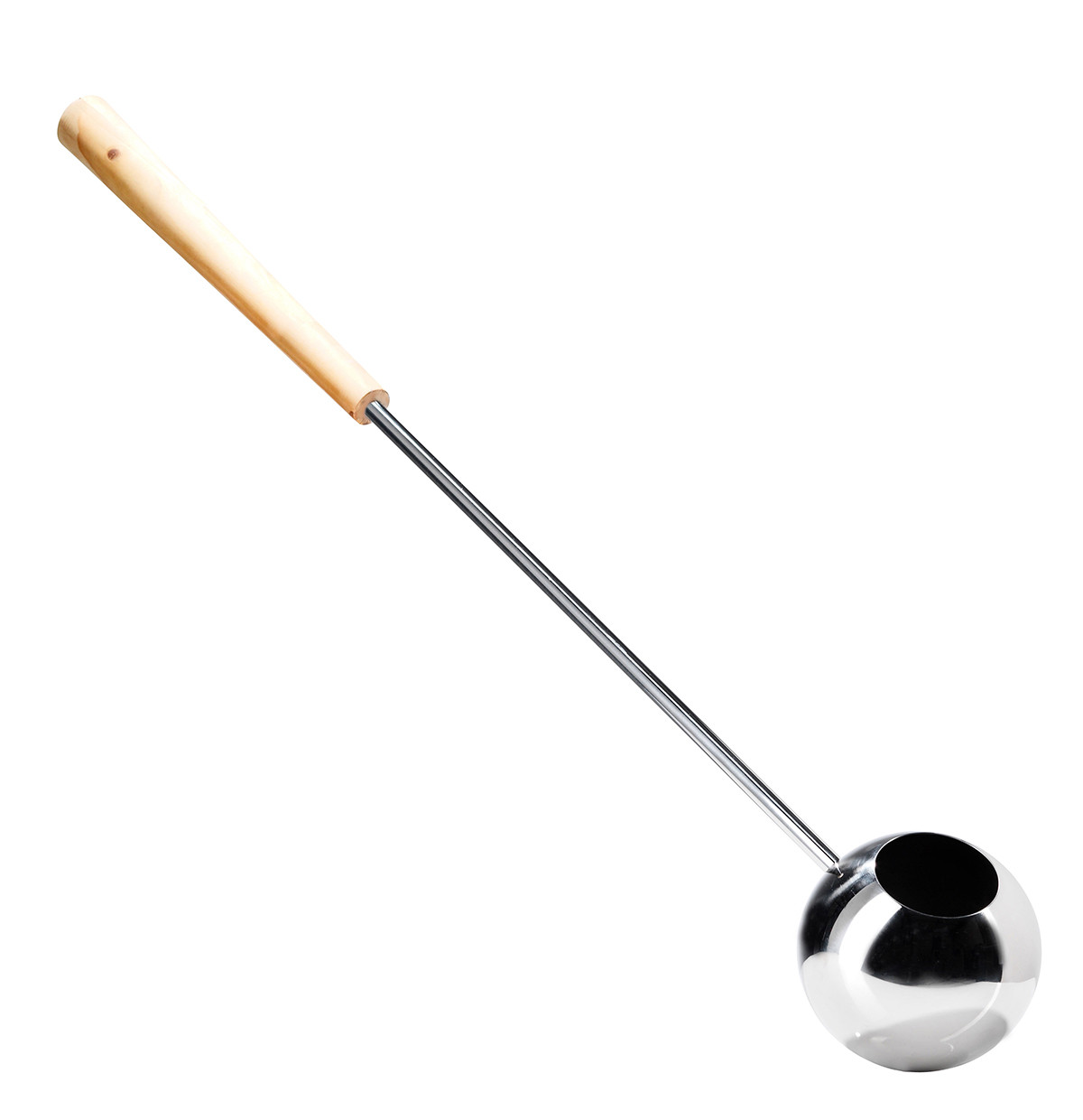 Novinka! Designová kulatá naběračka o délce 70 cm, průměr koule 10 cm. Kvalitní zpracování, slouží k tradičnímu finskému saunování - polevání saunových kamenů v kamnech vodou. Objem 0,5 l.
