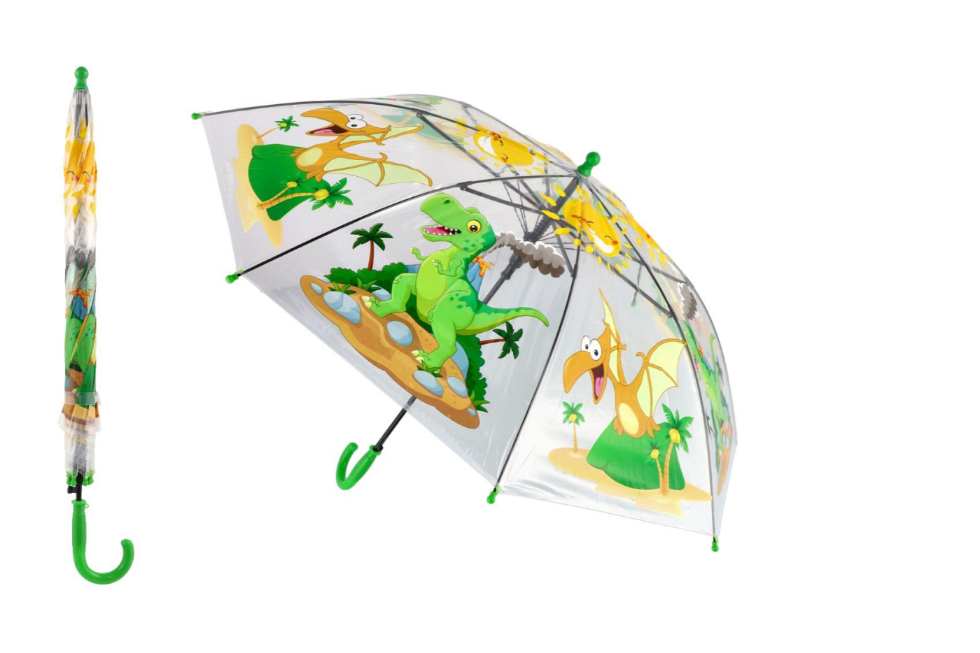 Když do deště, tak vesele s tímto průhledným deštníkem s barevným motivem dinosaura, který udělá radost všem dětem. A tak Vaše ratolesti budou moci prožít dobrodružství i v sychravém počasí. Deštník má vystřelovací otevírání. Deštníček budou moci děti nosit do školy, školky, nebo na výlety. Výška deštníku: 64 cm Rozměry výrobku 9 x 64 x 9 cm