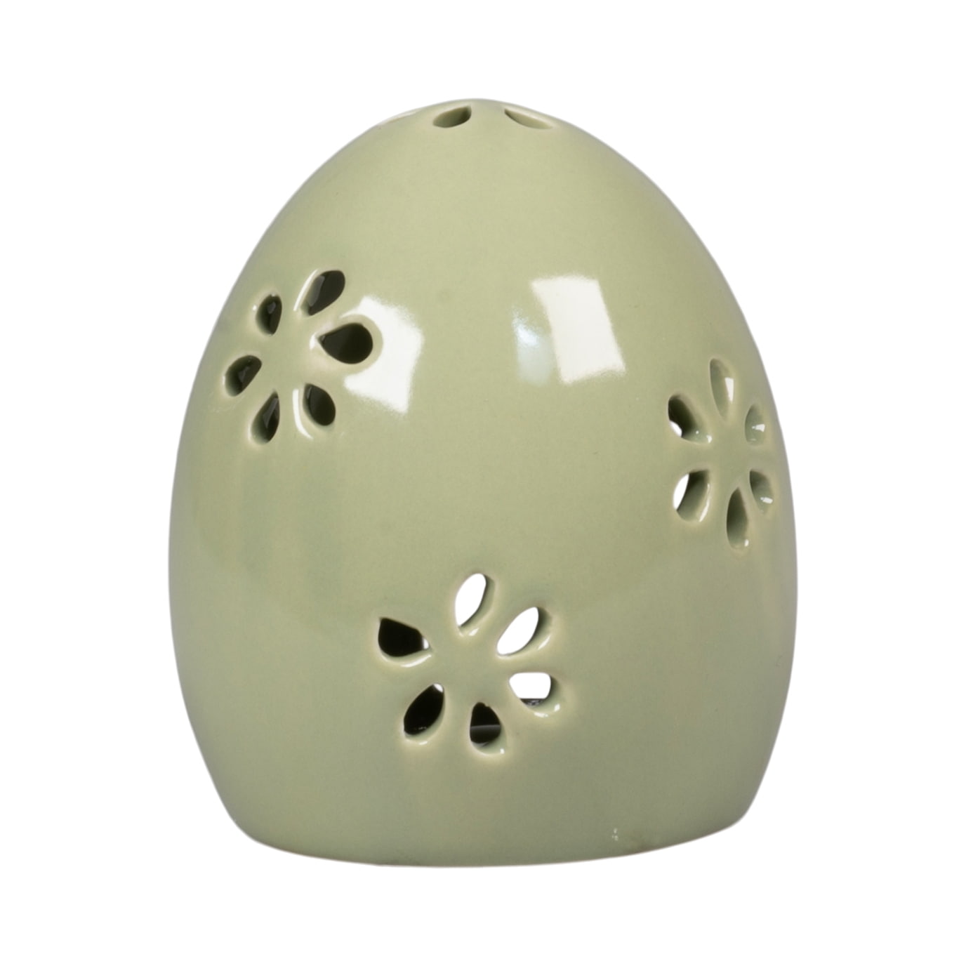 Umístěte na jídelní stůl, poličku nebo okenní parapet tento rozkošný velikonoční svícínek v podobě velikonoční kraslice s drobně vyřezávanými kytičkami a nechte světýlko čajové svíčky nebo malé LED svíčky prosvítat do prostoru. průměr 7,5 cm / výška 9 cm Vyrobeno z keramiky.