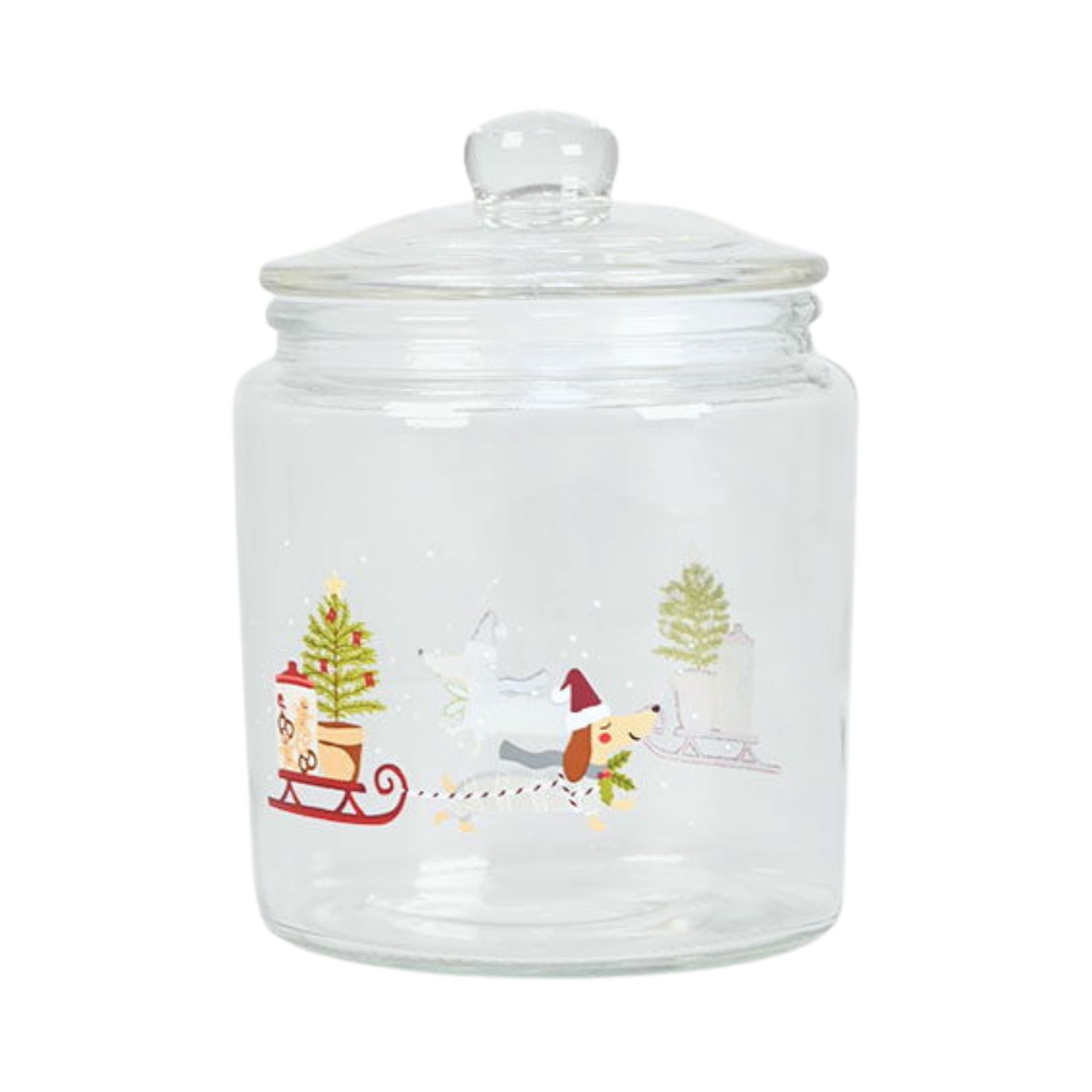 Det Gamle Apotek Skleněná dóza Christmas Holidays 16 cm, čirá barva, sklo. Tato skleněná dóza od Det Gamle Apotek z kolekce Christmas Holidays je krásným doplňkem do interiéru v kouzelném zimním období. Dóza je zdobena vánočním motivem, jehož hlavní aktér je malý jezevčík v kulichu. Skvěle poslouží jako úložná dóza na drobné cukroví, vánoční sladkosti, ale i na čajové svíčky nebo jako dekorativní prvek do kuchyně či obývacího pokoje.