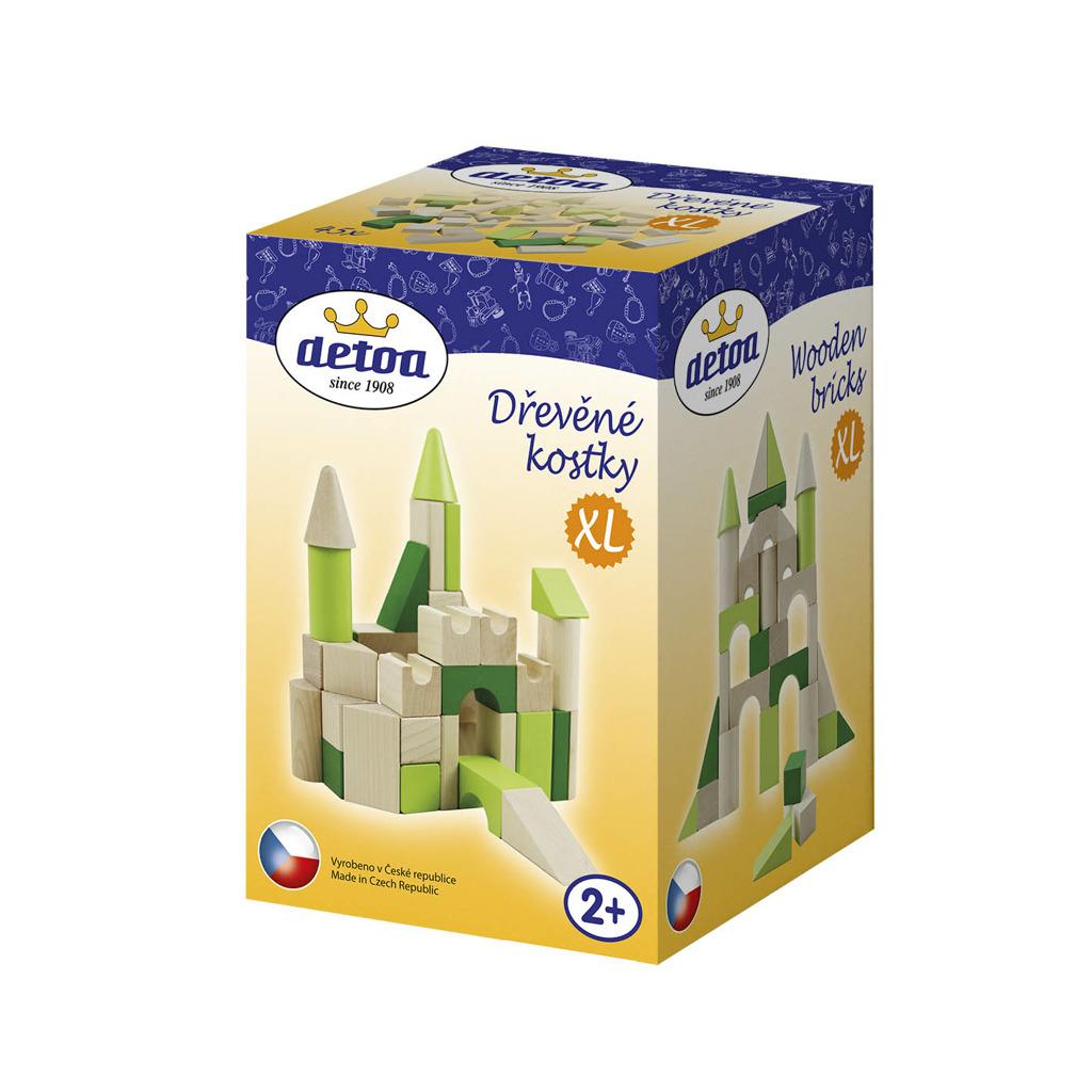 Inovovaná stavebnice skládající se z různých tvarů a velikostí dřevěných dílků v zeleno-přírodním barevném provedení. Kromě klasických krychlí, kvádrů a válečků obsahuje také jehlany, mosty a další tvary. Díky tomu lze postavit úžasné stavby. Stavebnice obsahuje 45 dílků. Základní velikost krychle je 27mm. Výrobek je vhodný pro děti od 2 let. Výrobek splňuje požadavky EU na bezpečnost hraček. Sada je balena do tvrdé lepenkové krabice.