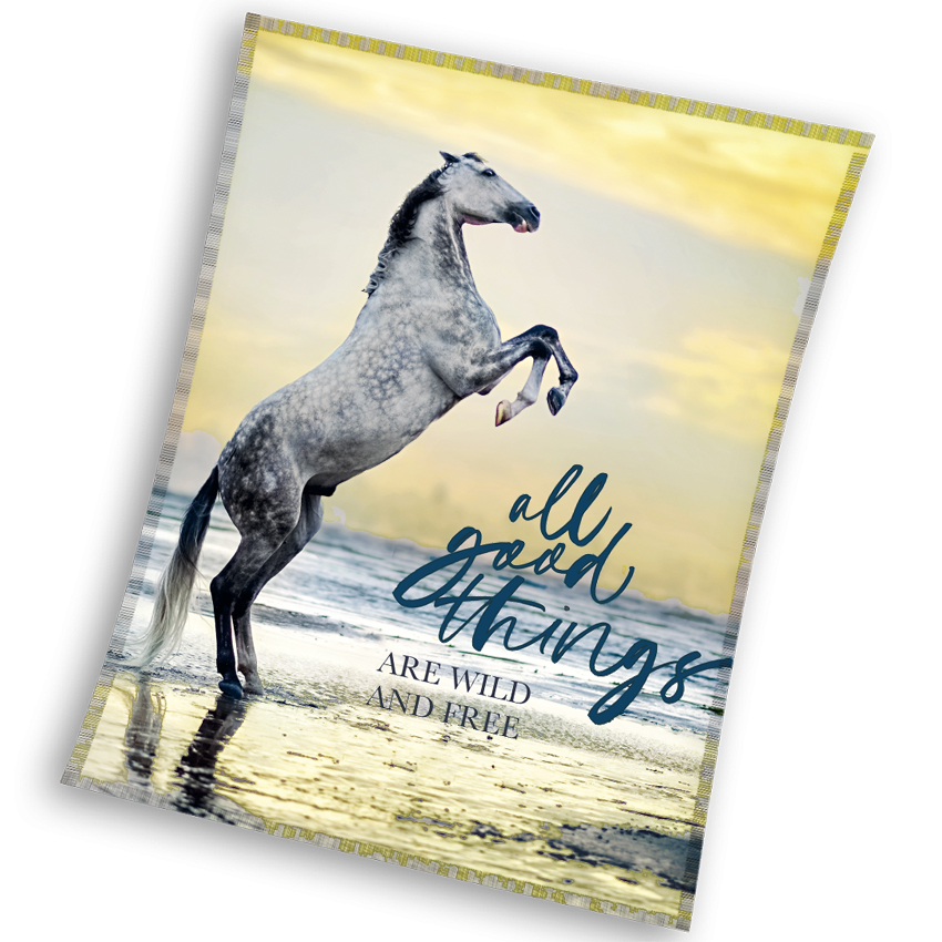 plyšová deka s Andaluským koněm Deka Kůň na pláži je vyrobena z hřejivého mikroplyše, 100% polyesteru, s gramáží 230 g/m²Deka je laděna do žluté a modré barvy, a na ní je skvostný kůň AndaluskýAndalusan je velmi temperamentní, odvážný a také především elegantní kůňPřeklad anglického nápisu znamená "Všechny dobré věci jsou svoboda a volnost" Hřejivý efekt ještě navíc podtrhne rozměr této deky, který je 150x200 cm Tato deka nadchne především pro svůj plyšový materiál, do kterého se bude chtít naprosto každý zachumlatDeka Koně na louce se také pyšní certifikátem Oeko-Tex Standard 100 a není tištěná fototiskem!Protože je deka vyrobena z plyšového materiálu (Coral Polyester), nabízí hned několik výhodPlyšový materiál má jemný a sametový vzhled s krátkými vlákny, které vypadají jako korálové útesy, odtud pochází jeho názevPokud jde o teplo, plyšové deky zadržují teplo a tvoří izolační vrstvu, což znamená, že udržují teplo blízko vašeho tělaDeka je odolná vůči pomačkání, takže si po dlouhém používání stále udržují svůj tvar a vzhledDeky lze snadno čistit v pračce a sušit v sušičce, což znamená méně práce pro vás Údržba deky je velice snadná, držte se při praní symbolů, které jsou uvedeny na obaleNepoužívejte při praní prací prostředky s obsahem bělidel a rozjasňujících substancíOdstřeďujte při nižších otáčkách, aby nedošlo k polámání a poškození vláken Odstíny barev obrázků se mohou barevně lišit v závislosti na nastavení vašeho monitoru