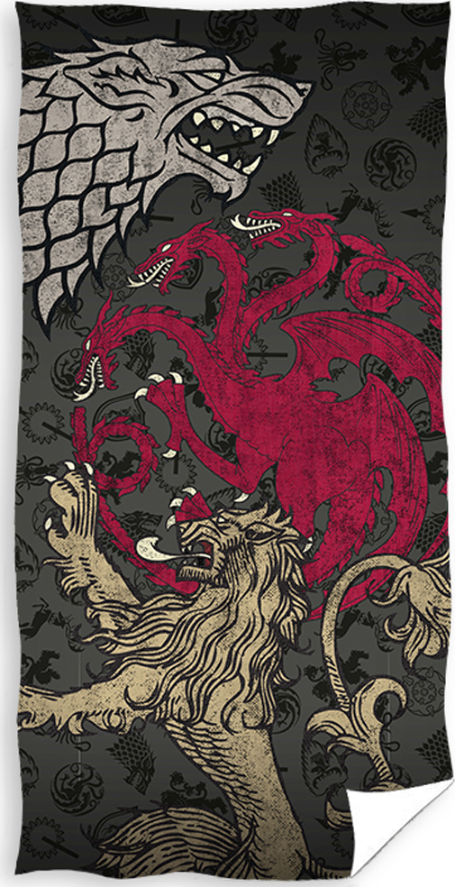 froté osuška s Heraldickými zvířaty Froté osuška Hra o Trůny Píseň Ledu a Ohně, je vyrobena ze 100% bavlnyNa osušce jsou tři heraldická zvířata z erbů- Šedý zlovlk, Červený drak a Zlatý levVlk je znakem rodu Starků, drak rodu Targaryenů a lev je znakem LannisterůNa šedém podkladu jsou další černá heraldická zvířata, které představují další rodyReverzní stranu osušky tvoří hustě tkaná froté smyčka, díky níž je zaručena dobrá savostRozměry osušky jsou 70x140 cm, s gramáží 300 g/m²Froté osuškou Hra o Trůny Píseň Ledu a Ohně nadchnete všechny GOT fanoušky Při praní osušky dodržujte symboly, které jsou uvedeny na štítkuNepoužívejte prací prostředky s obsahem bělících a rozjasňujících substancíOdstřeďujte při nižších otáčkách, aby nedošlo k poškození a polámání bavlněných vlákenAvivážní prostředky nedoporučujeme používat, mohou slepit vlákna, a tím snížit savost Odstíny barev obrázků se mohou barevně lehce lišit, v závislosti na nastavení Vašeho monitoru