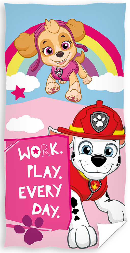 Osuška pro děti se Skye a Marhallem Froté osuška Tlapková Patrola Nejdřív Práce Potom Zábava, je vyrobena ze 100% bavlnyRozměry dětské osušky jsou 70x140 cm, a její gramáž je 300 g/m²Na lícní straně osušky jsou dvě roztomilá záchranářská štěňata Skye a MarshallOba dva vypadají jakoby doslova běželi mezi obláčky a barevnou duhouUrčitě teď oba dva spinkají a ve svých snech se prohánějí právě mezi obláčkyUdělejte svým dětem radost touto barevnou osuškou se záchranářským štěňaty z dětského seriálu Paw PatrolBarevná strana osušky je z jemně střiženého froté, velurová, velice příjemná na dotekReverzní stranu tvoří hustě tkaná froté smyčka bílé barvyOsuška má certifikát Oeko-Tex Standard 100V naší nabídce najdete kromě osušek také povlečení, deky a polštářky s Tlapkovou Patrolou Osušku perte dle symbolů uvedených na štítku Nepoužívejte prací prostředky s obsahem bělících a rozjasňujících substancíOdstřeďujte při nižších otáčkách, aby nedošlo k polámání, a tak k trvalému poškození bavlněných vlákenAvivážní prostředky nedoporučujeme používat, mohu slepit vlákna a tím snížit savost Odstíny barev obrázků se mohou barevně lišit, v závislosti na nastavení Vašeho monitoru