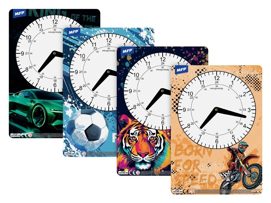 Dětské papírové hodiny v mixu chlapeckých motivů. Didaktická pomůcka, dobře využitelná k výuce času u dětí předškolního věku nebo u prvňáčků. Tyto cvičné hodiny nesmí chybět Vašemu dítěti při nástupu do první třídy základní školy. Upozornění: Nevhodné pro děti do 3 let. Nebezpečí vdechnutí a spolknutí malých částic.
