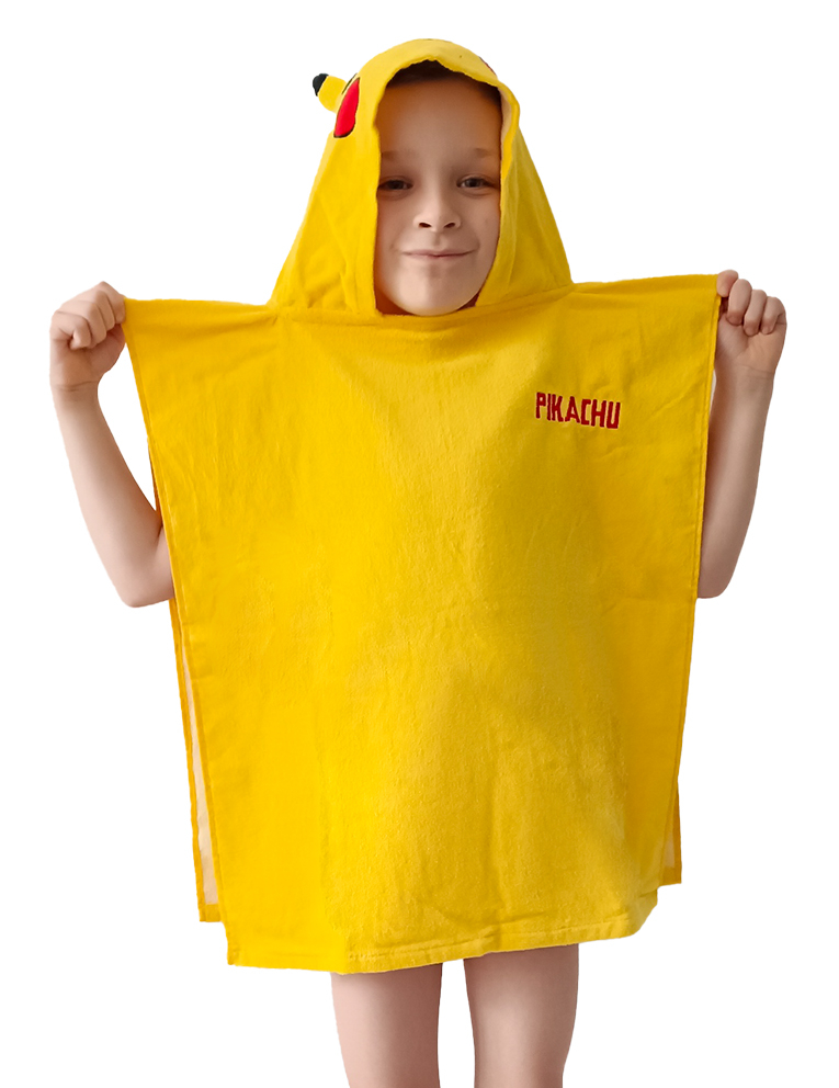 žluté pončo s pokémonem pikachu Froté pončo pro děti Pokémon Volím si tebe Pikachu je vyrobeno ze 100% bavlny, s gramáží 320 g/m²Žluté pončo je navrženo na motivy oblíbené žluté postavičky z pokémonů a to PikachuaPřední i zadní díl je celý žlutý bez vzoru, pouze na předním díle je červený nápis PikachuNa kapuci je však tvář tohoto rozkošného pokémona a nesmí chybět ani jeho ouškaPo nasazení tohoto ponča budete mít hned doma malého, rozkošného PikachuNení nutno hledat osušku, nebo ručník, když máte po ruce froté pončo s kapucíRozměry ponča jsou 50x115 cm a je vhodný pro děti od 3 do 6 let Lícní strana ponča je z jemně střiženého froté, velurová a její hladký povrch je velice příjemný na dotekVelmi dobrou savost zajistí hustě tkaná froté smyčka, která tvoří rubovou stranu pončaPončo má certifikát Oeko-Tex Standard 100Model na fotografii má výšku 130 cmFotografie s modelem jsou chráněny autorskými právy!Pončo perte dle symbolů uvedených na štítkuNepoužívejte prací prostředky s obsahem bělících a rozjasňujících substancíAvivážní prostředky nedoporučujeme používat, mohu slepit vlákna a tím snížit savostOdstíny barev obrázků se mohou lehce barevně lišit, v závislosti na nastavení Vašeho monitoru