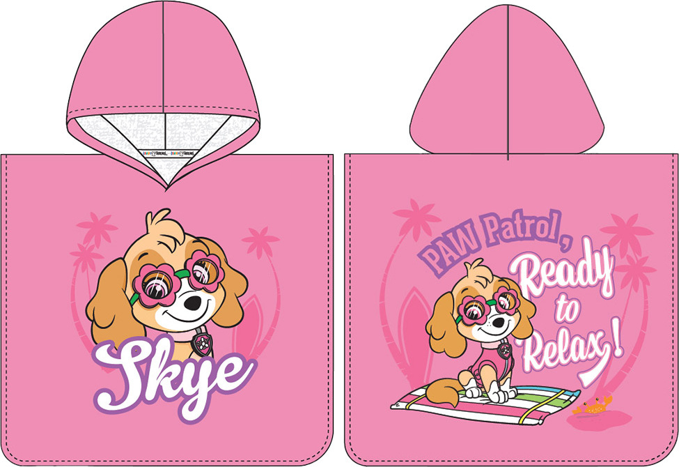 Růžové pončo s Fenečkou z Paw Patrol Froté pončo pro děti Tlapková Patrola Skye Relax Day je vyrobeno ze 100% bavlny s gramáží 300 g/m²Na přední i zadní straně ponča je obrázek psí fenečky, pilotky Skye, který vypadá, jakoby byl namalovaný pastelkamiKaždý se těší na léto, jak pojede k moří a u našich psích kamarádů tomu není jinakSkye si nasadila své květinkované brýle a uvelebila mezi palmami kde je již připravená k relaxování a odpočinkuKaždá malé fanynka teď může mít svou Skye u sebe v bazénu, nebo na pláži Není nutno hledat osušku, nebo ručník, když máte po ruce froté pončo s kapucíPončo má rozměry 50x115 cm, a je vhodný pro děti od 3 do 6 letLícní strana ponča je z jemně střiženého froté, velurová a její hladký povrch je velice příjemný na dotekVelmi dobrou savost zajistí hustě tkaná froté smyčka, která tvoří rubovou stranu pončaV naší nabídce naleznete další produkty s pejsky z Tlapkové PatrolyPončo perte dle symbolů uvedených na štítkuNepoužívejte prací prostředky s obsahem bělících a rozjasňujících substancíOdstřeďujte při nižších otáčkách, aby nedošlo k polámání, a tak k trvalému poškození bavlněných vlákenAvivážní prostředky nedoporučujeme používat, mohu slepit vlákna a tím snížit savostOdstíny barev obrázků se mohou lehce lišit, v závislosti na nastavení Vašeho monitoru