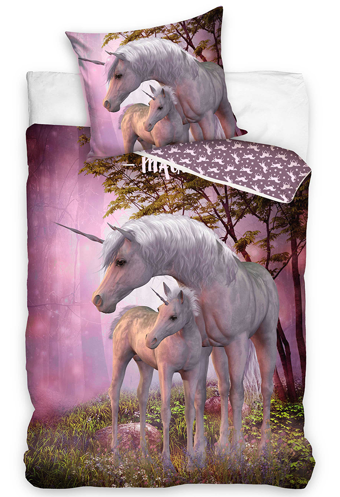 povlečení s kouzelnými jednorožci Bavlněné povlečení Jednorožec Bájný Krasavec, je vyrobeno ze 100% hladké bavlny renforcéToto oboustranné povlečení má rozměry peřiny 140x200 cm a polštáře 70x90 cmNa reverzní straně povlaku přikrývky se na mýtině pasou dva bájní jednorožciTyto neskutečně krásné bytosti mohou prý pomocí svého rohu přetvořit sluneční svit v duhuDíky tomuto povlečení se všechny slečny dostanou do pohádkového světa jednorožcůReverzní strana přikrývky je fialová a jsou na ní růžové obrázky jednorožců a hvězdičekPovlak polštáře je z obou stran stejně laděný jako lícní strana povlaku přikrývkyPovlečení má certifikát Oeko-Tex Standard 100 a je opatřeno zipovým zapínánímVhodnou barvou prostěradla bude fialková a růžová Doporučujeme praní maximálně na 60°C, pro více probarvené povlečení však raději využijte 40°CPovlečení vždy perte z rubu, odděleně a se zapnutým zipovým uzávěremOdstřeďujte při nižších otáčkách, aby nedošlo k polámání bavlněných vláken, a tak k jejich trvalému poškozeníNepoužívejte prací prostředky s obsahem bělících a rozjasňujících substancíNedoporučujeme používání avivážních prostředků, mohou slepit bavlněná vlákna a snížit tak jejich savost Odstíny barev obrázků se mohou barevně lišit, v závislosti na nastavení Vašeho monitoru