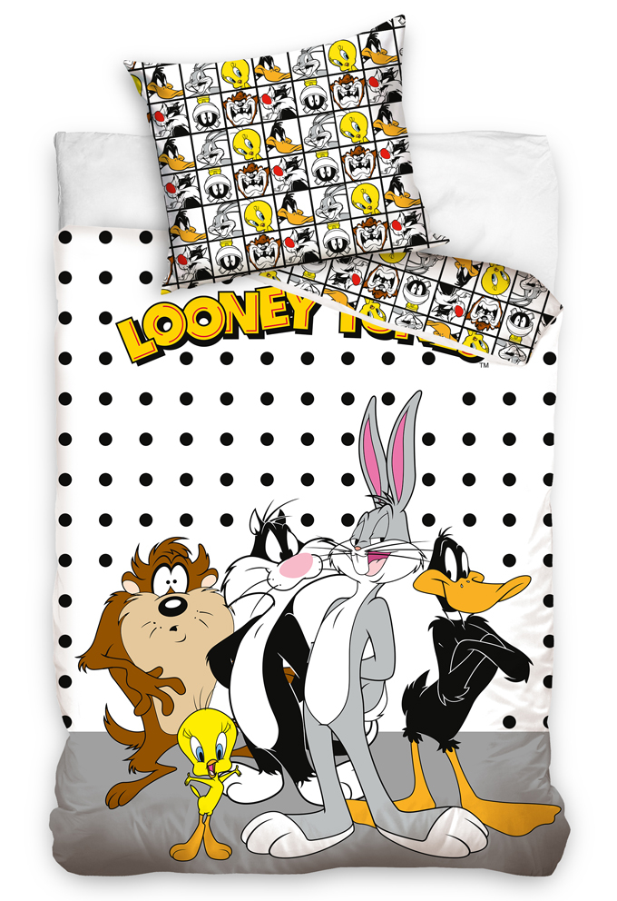 Bavlněné povlečení LoonEy Tunes Oboustranné dětské povlečení Kamarádi z Looney Tunes je vyrobeno ze 100% hladké balny renforce a jeho rozměry jsou 140x200/ 70x90 cmNa lícní straně povlečení najdeme své oblíbence, jako jsou Tweety, Bugs Bunny, Duffy, Sylvester a TazTy všechny můžete vidět na lícní straně bavlněného povlečení, která je bílé barvy s černými puntíkyV dolní části povlaku je široký šedý pás a v horní části vede velký nápis LOONEY TUNESReverzní strana povlaku přikrývky je tvořena malými čtverci, ve kterých jsou podobizny těchto postavičekPovlak polštáře je z obou stran stejný, shodný s reverzní stranou povlaku přikrývkyPovlečení má zipové zapínáníVhodnou barvou prostěradel bude žlutá, bílá, černá a červenáKromě povlečení najdete v naší nabídce také ručníčky, osušky a polštářky Looney Tunes Povlečení perte vždy z rubu, se zapnutým zipem, dle symbolů uvedených na obaleNepoužívejte prací prostředky s obsahem bělících a rozjasňujících substancíOdstřeďujte při nižších otáčkách, aby nedošlo k polámání, a tak k poškození bavlněných vláken Odstíny barev obrázků se mohou barevně lišit, v závislosti na nastavení Vašeho monitoru