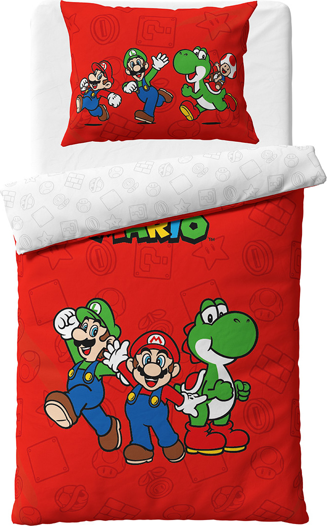 červené Povlečení s Mariem a Luigim Bavlněné povlečení Super Mario Luigi a Yoshi je vyrobeno ze 100% hladké bavlny renforceToto oboustranné povlečení má rozměry peřiny 140x200 cm a polštáře 70x90 cmNa červeném povlečení jsou postavičky Mario, Luigi a Yoshi z oblíbené hry Super MarioDvojice italských bratrů instalatérů Mario a Luigi putují světy Mushroom Kingdom Překonávají zde složité překážky, aby se dostali až k princezně Peach, kterou unesl zlá obří želva BowserPodklad lícní strany tvoří obrázky, typické pro tuto hru, jako houby, mince, kostičky, květinky a dalšíRubová strana je v bílé barvě a jsou na ní stejné obrázky, jako na podkladu lícní stranyPovlak polštáře je z obou stran stejný a jsou na ní veselé postavičky Mario, Luigi, Yoshi a ToadK povlečení doporučujeme prostěradla například ve bílé, šedé a červené barvěPovlečení má certifikát Oeko-Tex Standard 100 a je opatřeno zipovým zapínáním Bavlněné povlečení perte vždy z rubu, se zapnutým zipem, dle symbolů uvedených na obaleNepoužívejte prací prostředky s obsahem bělících a rozjasňujících substancíPovlečení odstřeďujte při menších otáčkách, aby nedošlo k trvalému poškození bavlněných vláken Odstíny barev obrázků se mohou barevně lišit, v závislosti na nastavení Vašeho monitoru