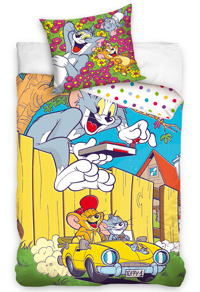 Bavlněné povlečení s Tomem a Jerrym Bavlněné povlečení Tom a Jerry Ve žlutém kabrioletu, je oboustranné a je vyrobeno ze 100% hladké bavlny RenforcéNa lícní straně povlečení jsou Jerry a Tuffy v kabrňáckém, žlutém kabrioletuAutíčko má pouze jednu chybu, a to tu, že je na dálkové ovládání, které třímá ve svých kočičích prackách Tom, nám všem známý uličníkReverzní strana povlečení je bílá s malými různobarevnými puntíkyPovlak polštáře je z obou stran stejný, v tuto chvíli kamarádští Tom a Jerry, leží v záplavě květinRozměr povlečení je 140x200 + 70x90 cm a má zipové zapínáníVhodná barva prostěradla bude bílá, žlutí, nebo středně modráPovlečení má certifikát Oeko-Tex Standard 100 Bavlněné povlečení perte vždy z rubu, se zapnutým zipem, dle symbolů uvedených na obale Nepoužívejte prací prostředky s obsahem bělících a rozjasňujících substancí Povlečení odstřeďujte při menších otáčkách, aby nedošlo k trvalému poškození bavlněných vláken Odstíny barev obrázků se mohou barevně lišit, v závislosti na nastavení Vašeho monitoru