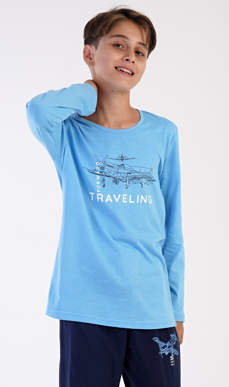 Dětské chlapecké bavlněné pyžamo Letadlo. Pyžamo se skládá z trika s dlouhým rukávem a dlouhých kalhot. Triko s kulatým výstřihem zdobí obrázek letadla a nápis 'Traveling forward'. Jednobarevné dlouhé kalhoty mají v pase gumu a jsou zakončeny lemy. Použitý bavlněný materiál je příjemný a poddajný na dotek. Pokyny pro údržbu: - 100% bavlna - lze prát v pračce při teplotě do 30° - nesušit v sušičce - žehlit z rubu do 110° - nepoužívat bělící prostředky - nečistit chemicky Míry naměřené na výrobku: 3060230000 Letadlo 3-4 5-6 7-8 9-10 obvod hrudníku 58 66 68 76 délka trika 46 50 54 59 pas 44-56 46-58 48-60 52-64 délka kalhot 59 69 79 89