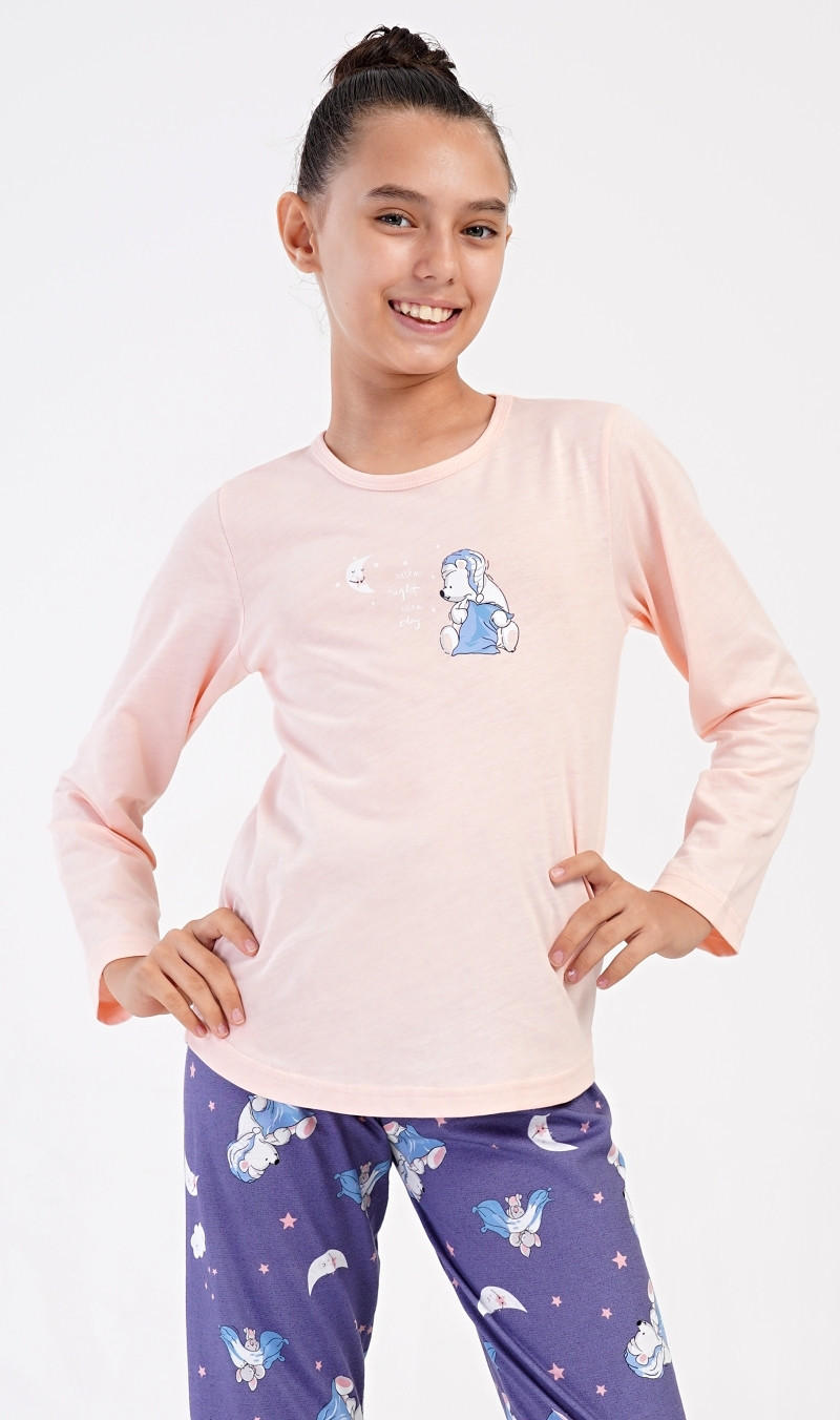 Dětské dlouhé bavlněné pyžamo Méďa s polštářem. Pyžamo se skládá z trika s dlouhým rukávem a dlouhých kalhot. Na triku s kulatým výstřihem je obrázek ledního medvídka s polštářem. Tento motiv se opakuje i na dlouhých kalhotách, které mají v pase gumu na stažení. Kalhoty nemají kapsy a jsou zakončeny lemy. Použitý bavlněný materiál je příjemný a poddajný na dotek . Pokyny pro údržbu: - 100% bavlna - lze prát v pračce při teplotě do 30° - nesušit v sušičce - žehlit z rubu do 110° - nepoužívat bělící prostředky - nečistit chemicky Míry naměřené na výrobku: 4052885486 Méďa s polštářem 3-4 5-6 7-8 obvod hrudníku 64 66 70 délka trika 43 45 50 pas 46-58 52-64 56-68 délka kalhot 57 67 77