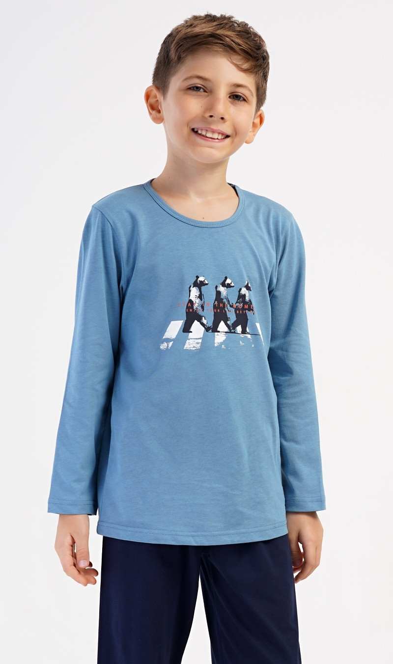 Dětské chlapecké bavlněné pyžamo Tobias. Pyžamo se skládá z trika s dlouhým rukávem a dlouhých kalhot. Triko s kulatým výstřihem zdobí obrázek tří medvědů na přechodu. Jednobarevné dlouhé kalhoty mají v pase gumu a šňůrku na stažení, jsou bez kapes. Použitý bavlněný materiál je příjemný a poddajný na dotek. Pokyny pro údržbu: - 100% bavlna - lze prát v pračce při teplotě do 30° - nesušit v sušičce - žehlit z rubu do 110° - nepoužívat bělící prostředky - nečistit chemicky Míry naměřené na výrobku: 4053100000 Tobias 9-10 11-12 13-14 15-16 obvod hrudníku 76 84 88 94 délka trika 56 58 64 67 pas 64-76 68-80 70-82 74-86 délka kalhot 83 87 91 102