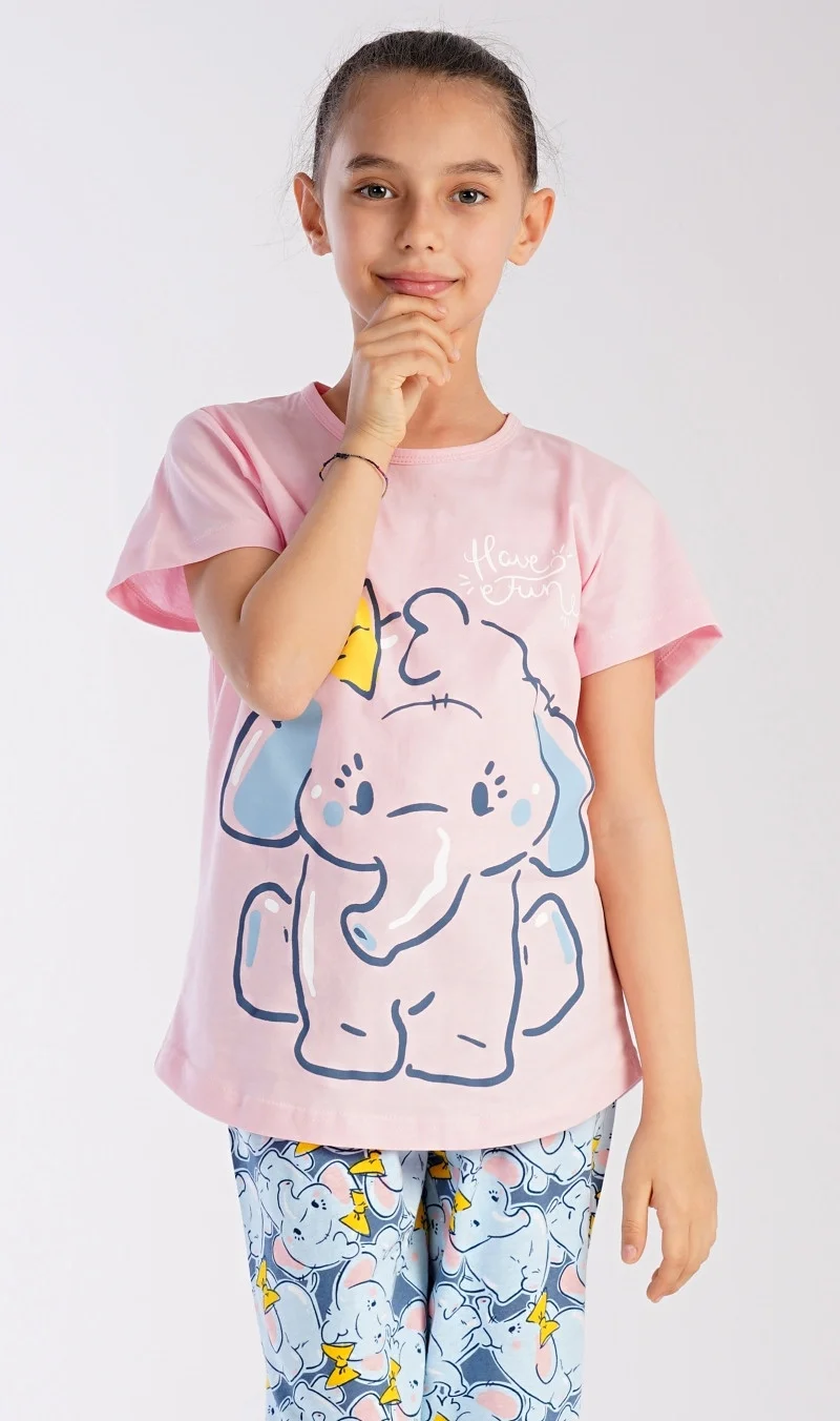 Dětské bavlněné pyžamo kapri Slůně. Dětské pyžamo se skládá z trička s krátkým rukávem a tříčtvrtečních kalhot. Na jednobarevném tričku je velký obrázek slůněte. Tento motiv se opakuje i na kalhotách. Použitý bavlněný materiál je příjemný a poddajný na dotek. Pokyny pro údržbu: - 100% bavlna - lze prát v pračce při teplotě do 30° - nesušit v sušičce - žehlit z rubu do 110° - nepoužívat bělící prostředky - nečistit chemicky Míry naměřené na výrobku: 2124691602 Slůně 11-12 13-14 15-16 obvod hrudníku 80 82 88 délka trika 59 60 63 pas 58-70 90-72 62-74