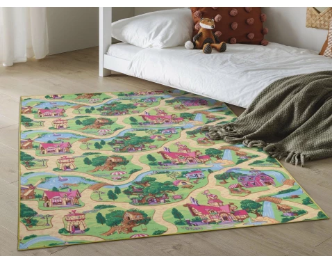 Dětský koberec s motivem malebné vesničky o rozměru 100x150 cm je ideální pro vytvoření hracího prostoru, kde se děti mohou ponořit do světa her s hračkami.