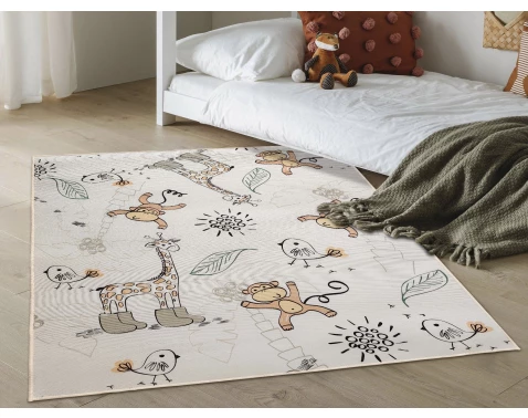 Hravý koberec 100×150 cm v bílé barvě s motivem žiraf, opiček a ptáčků rozzáří dětský pokoj. Podporuje fantazii a nabízí pohodlí pro hraní i odpočinek.