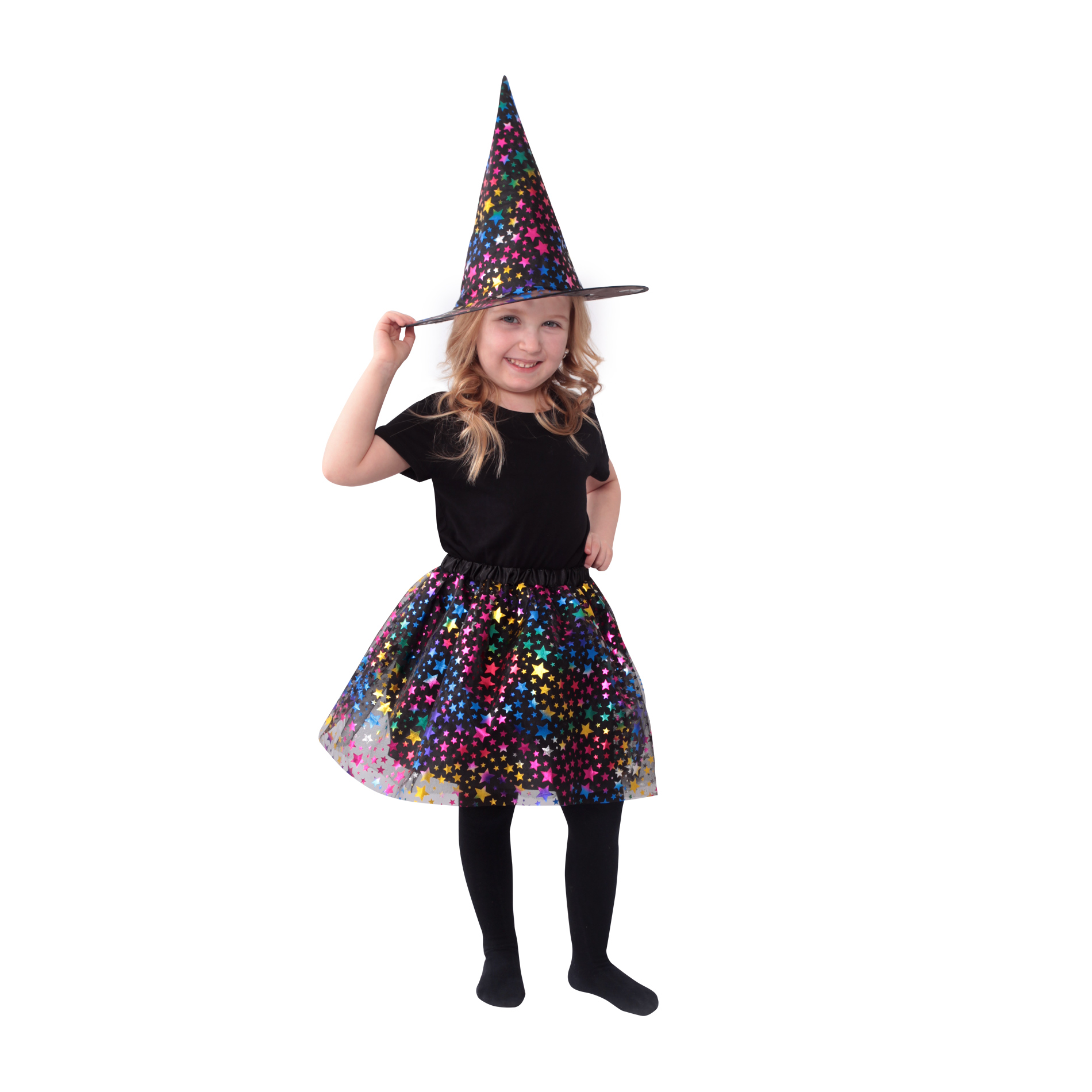 Magický kostýmek pro malé čarodějnice v černé barvě, zdobený barevným dekorem hvězdiček. Kostým je určen pro holčičky ve věkovém rozmezí 3-7 let. Vhodný i na oslavu Halloweenu. Balení obsahuje nadýchanou sukničku a k tomu perfektně sladěný klobouk. Délka sukýnky je cca 30 cm. Sukně je v pase na gumičku. Zakupte produkt Dětský kostým čarodějnice hvězda - tutu sukně s kloboukem z kategorie Hry, hračky, párty, karneval | Karneval | Kostýmy od výrobce RAPPA za cenu 112 Kč.