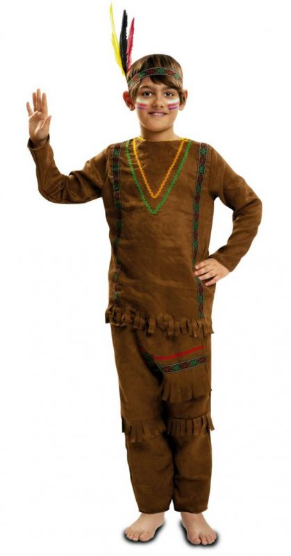 Dětký kostým - Indián - S Součástí kostýmu je čelenka, košile a kalhoty. Tmavohnědé kalhoty mají pod koleny našity třásně stejné barvy. Košile s dlouhými rukávy je taktéž z tmavohnědé látky. Spodní lem košile je z třásní. Výstřih je zdoben žlutou, zelenou a světlehnědou vlnitou stužkou. Na bocích hrudníku jsou dva svislé pruhy ozdobné barevné stuhy. Stejná stuha je použita i na čelenku se třemi barevnými pery a na ozdobení tmavohnědé zástěrky s třásněmi a červenou stuhou, která je součástí kalhot.