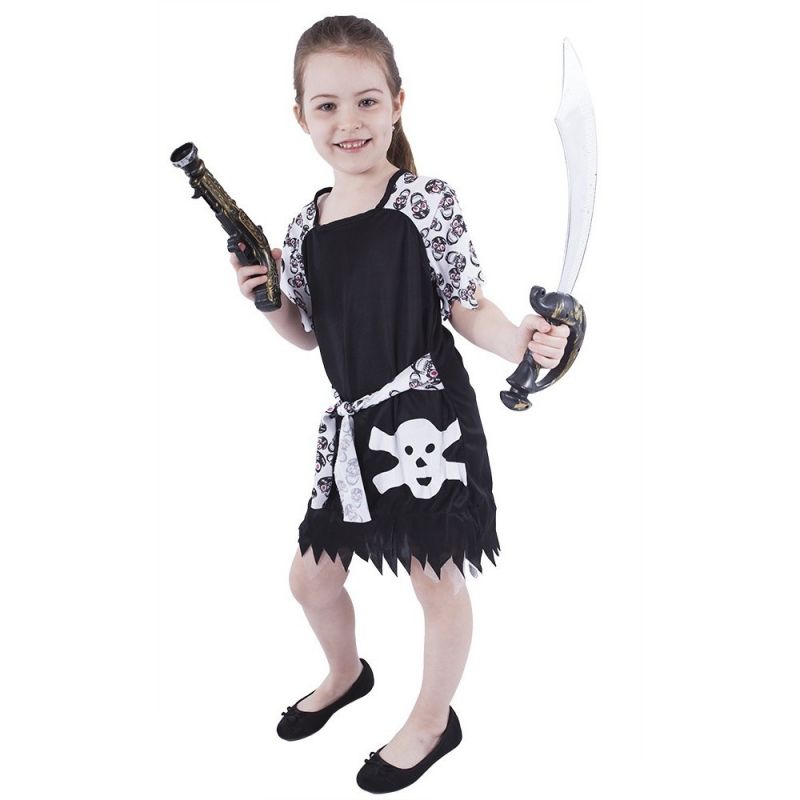 Malé dobrodružství volá! S tímto dětským kostýmem pirátky se každá malá slečna promění v odvážnou mořskou lupičku. Kostým zahrnuje typické pirátské prvky, jako jsou pruhované detaily, šaty se sukní a stylové doplňky, které dodají celkovému vzhledu tu pravou pirátskou atmosféru. Ideální volba na karneval, tematickou párty nebo školní vystoupení. Pohodlný střih a lehký materiál zajistí maximální komfort při nošení i během celodenního pirátského dobrodružství. Balení obsahuje šaty, které jsou ušity z černo-bílých barev a nechybí na nich obrázky kostry.